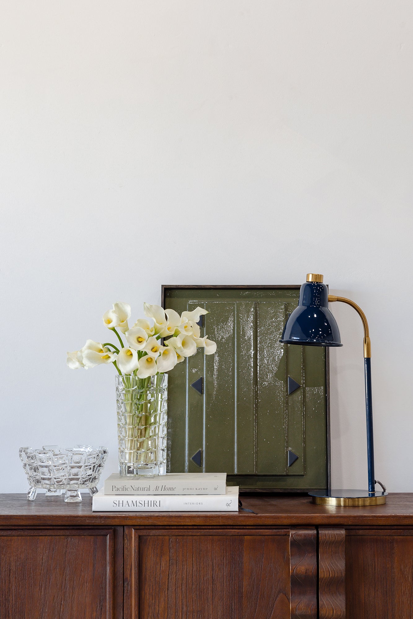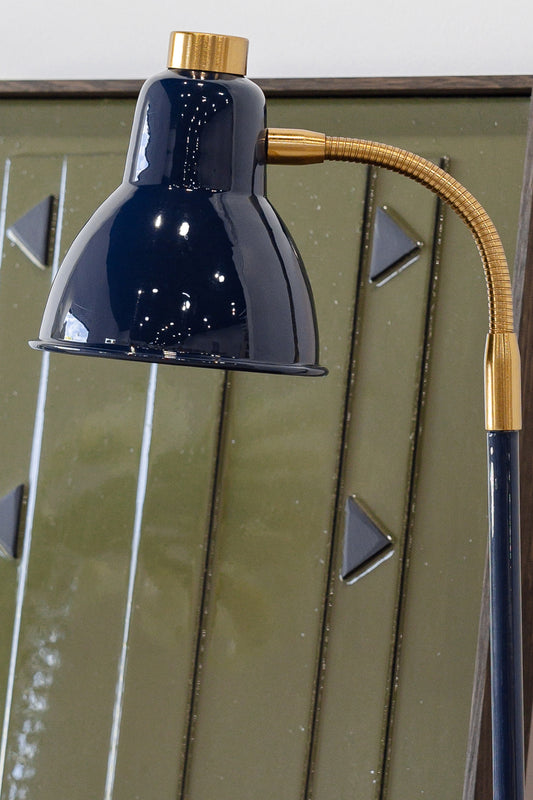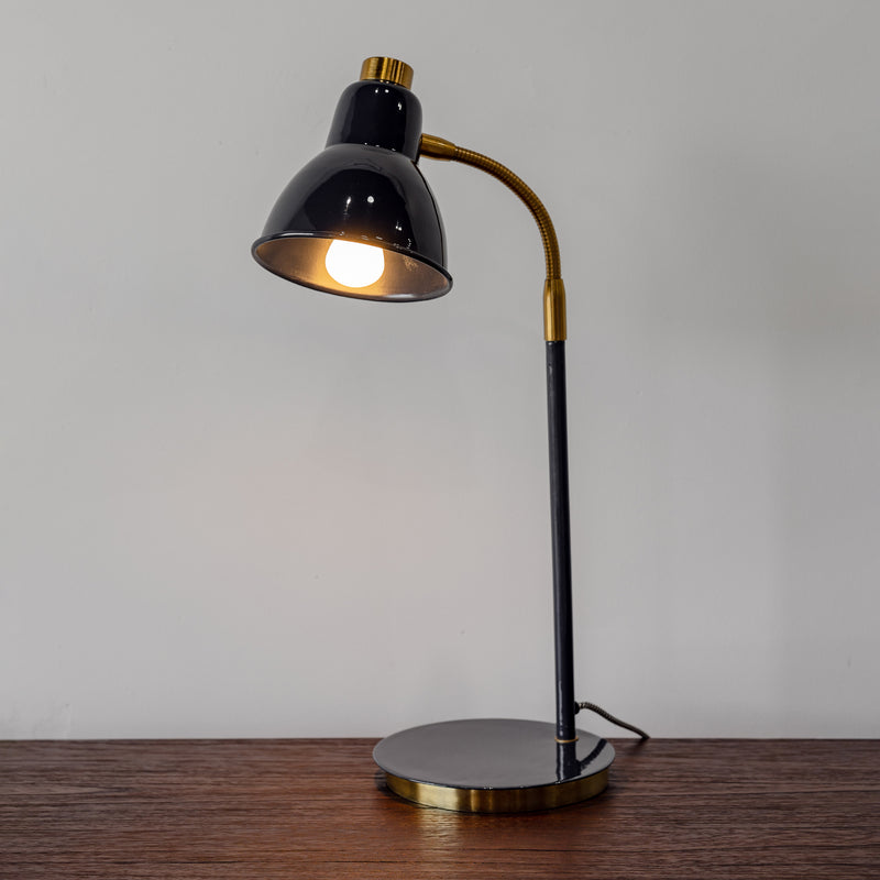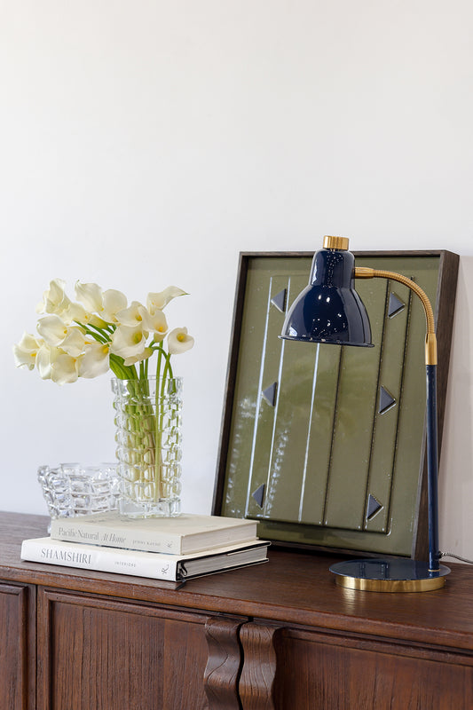 A timeless accent with a refined edge, the Celeste Table Lamp combines a classic curved shade with elegant brass detailing and a deep navy finish. The adjustable arm adds both function and character, making it an ideal lighting solution for desks, bedside tables or reading nooks.