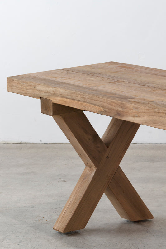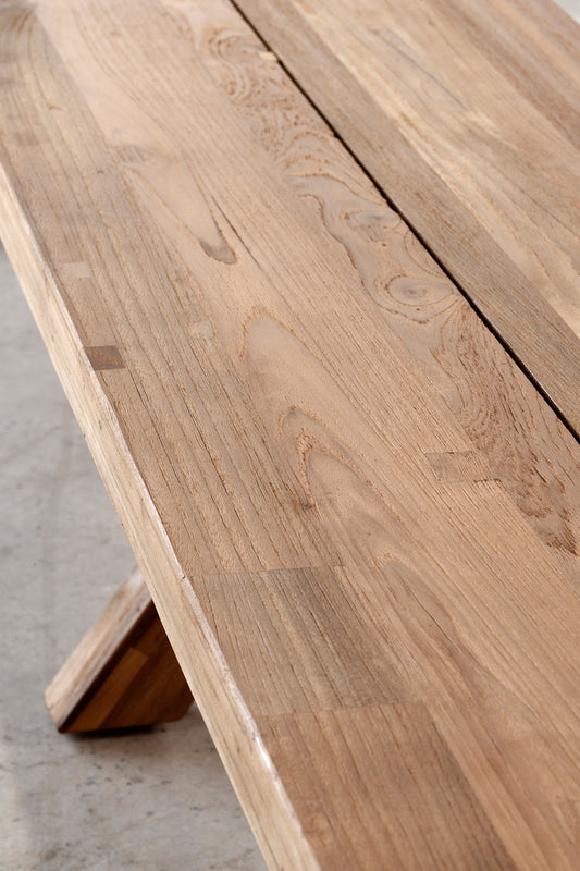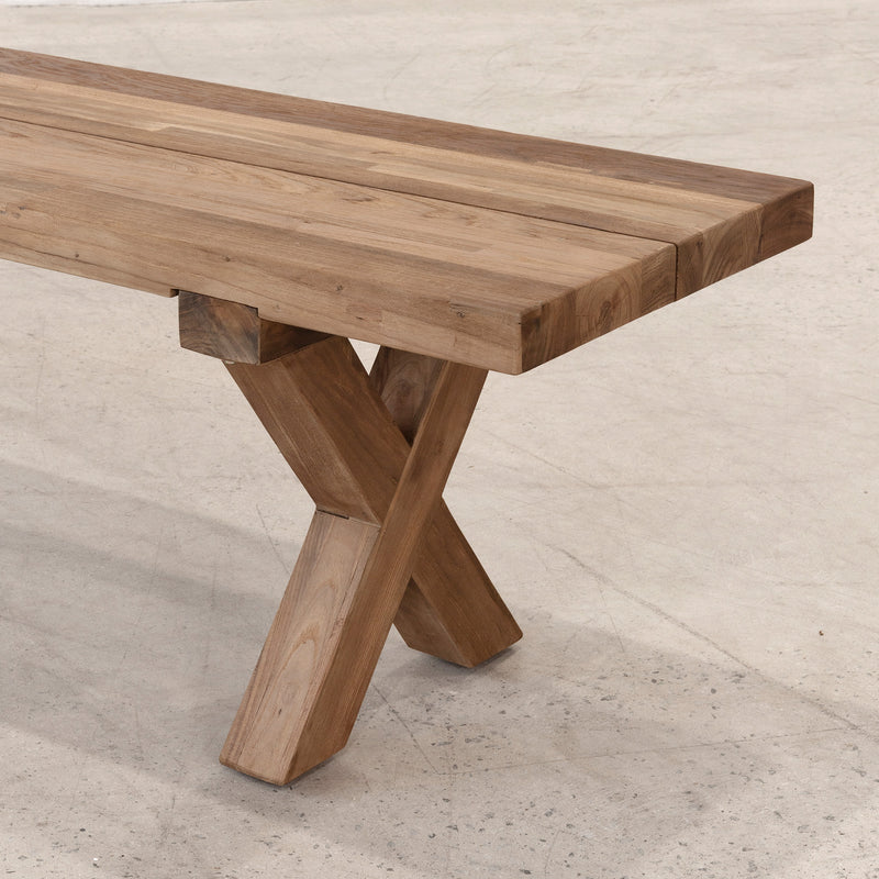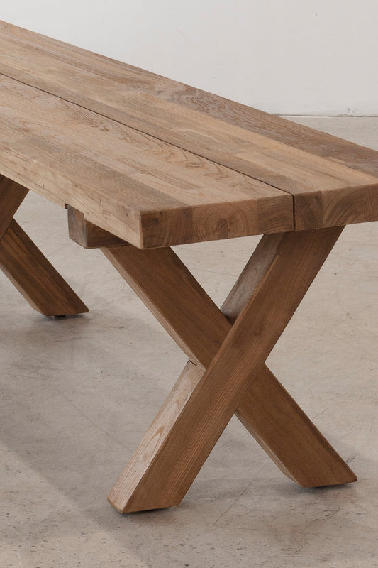 The Jackson X-Leg Bench is crafted from solid teak, designed for outdoor dining settings and generous communal seating. Its bold cross-leg base and substantial plank seat highlight the natural strength and durability of the timber. Weather-resistant and architectural in form, it brings warmth and enduring structure to alfresco spaces.