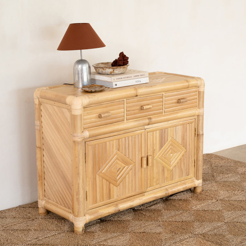 A refined bamboo console featuring three drawers for practical, stylish storage. Its warm tone and minimal lines complement modern coastal and contemporary interiors.