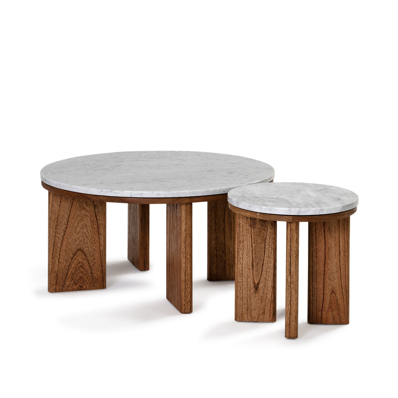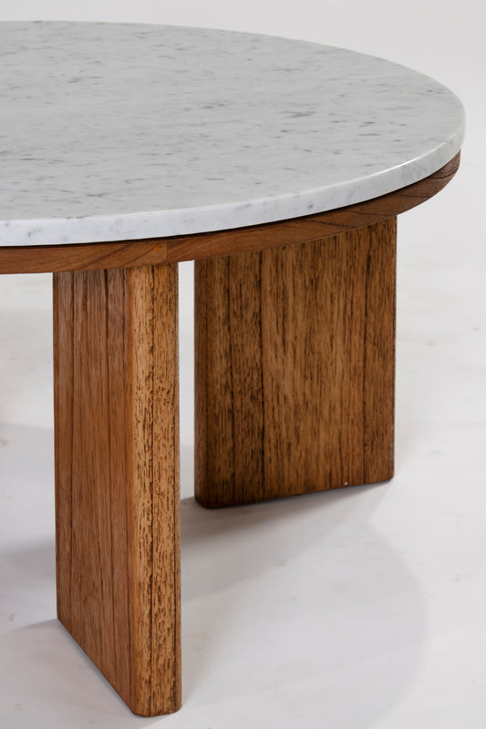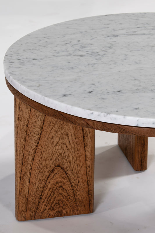 The West Coffee Table, constructed in sustainable mindi wood with an antique finish and Carrara marble top. Featuring unique angled leg design.