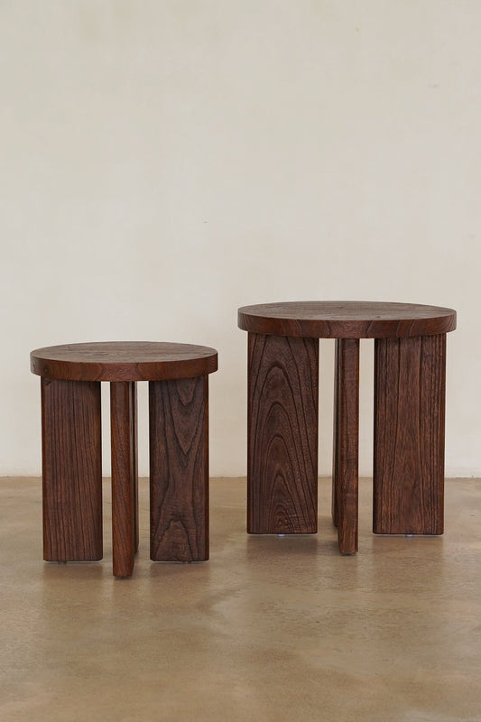 Finished in a rich rustic walnut tone, the West Side Table features a sculptural, solid form with a rounded top and strong vertical supports. Its compact proportions make it a versatile accent beside beds, sofas, or armchairs, while the warmth of the finish adds depth and character to the space. Available in two sizes, this side table layers seamlessly into both contemporary and classic interiors.