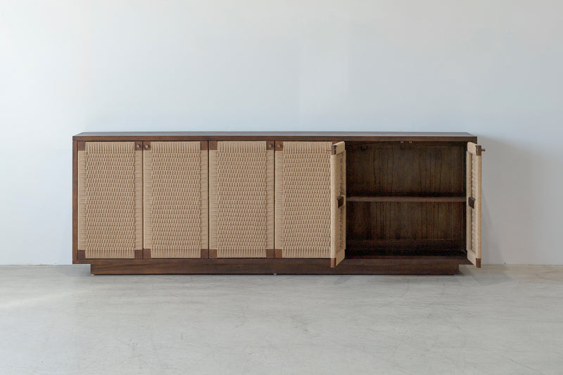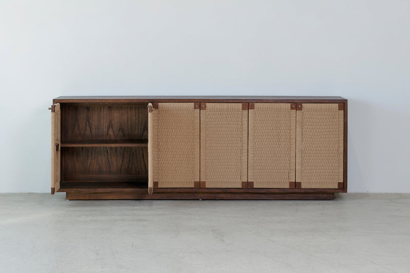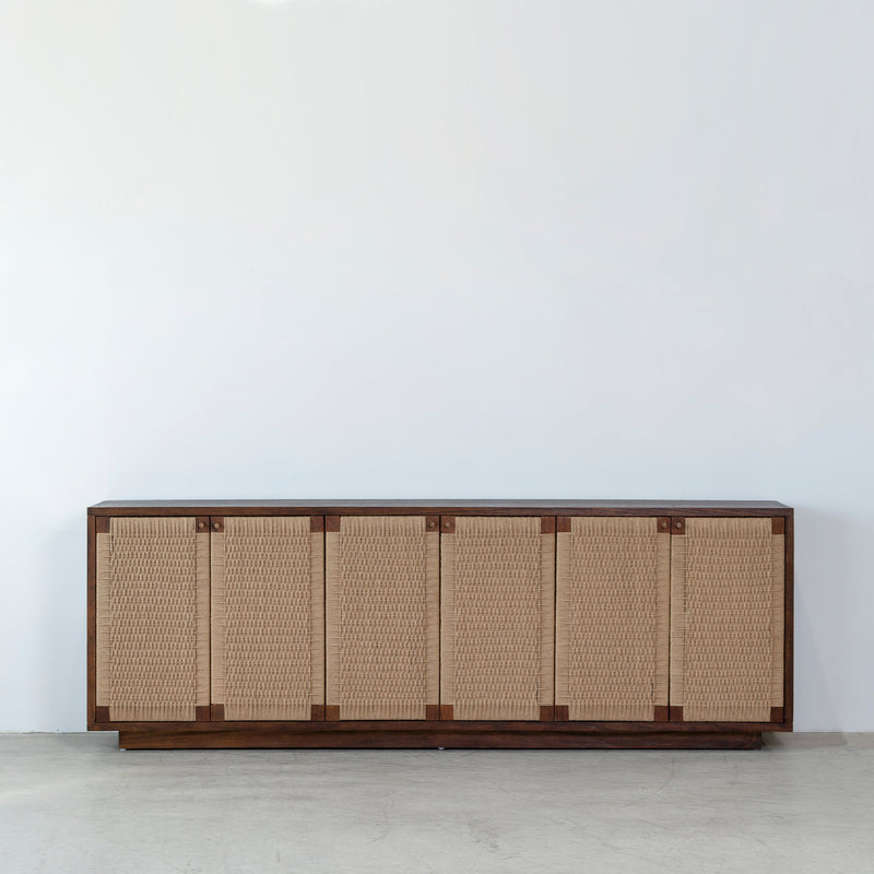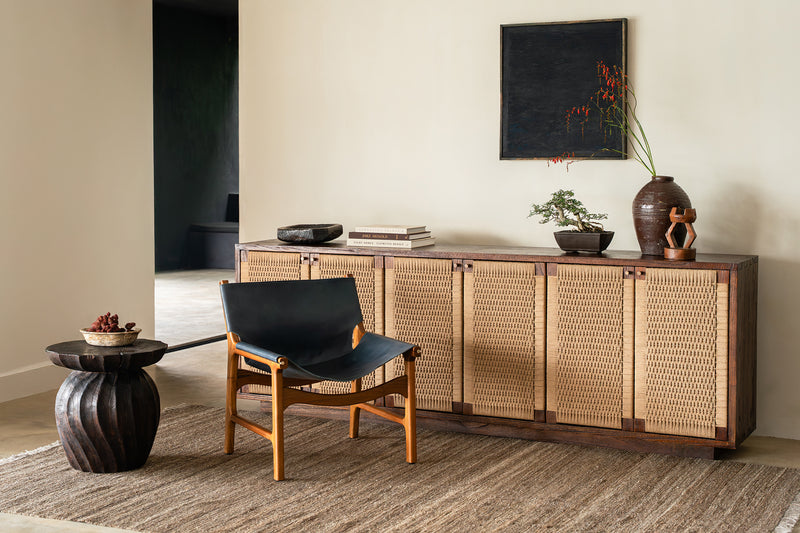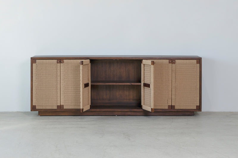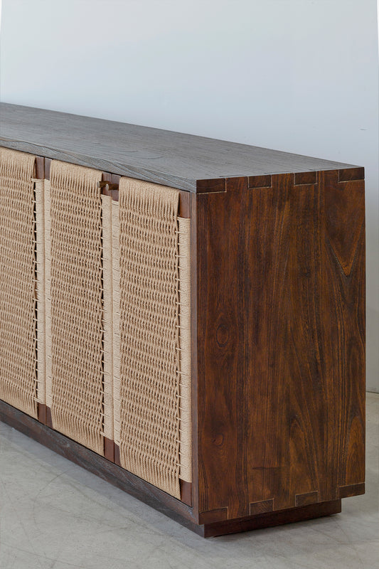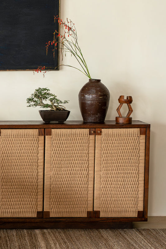The Holly Buffet, made from solid mango wood in a rustic walnut finish. Elegant yet impactful, featuring woven doors, joinery edge detailing and small brass handles.