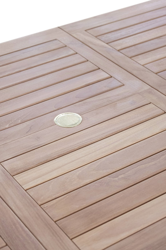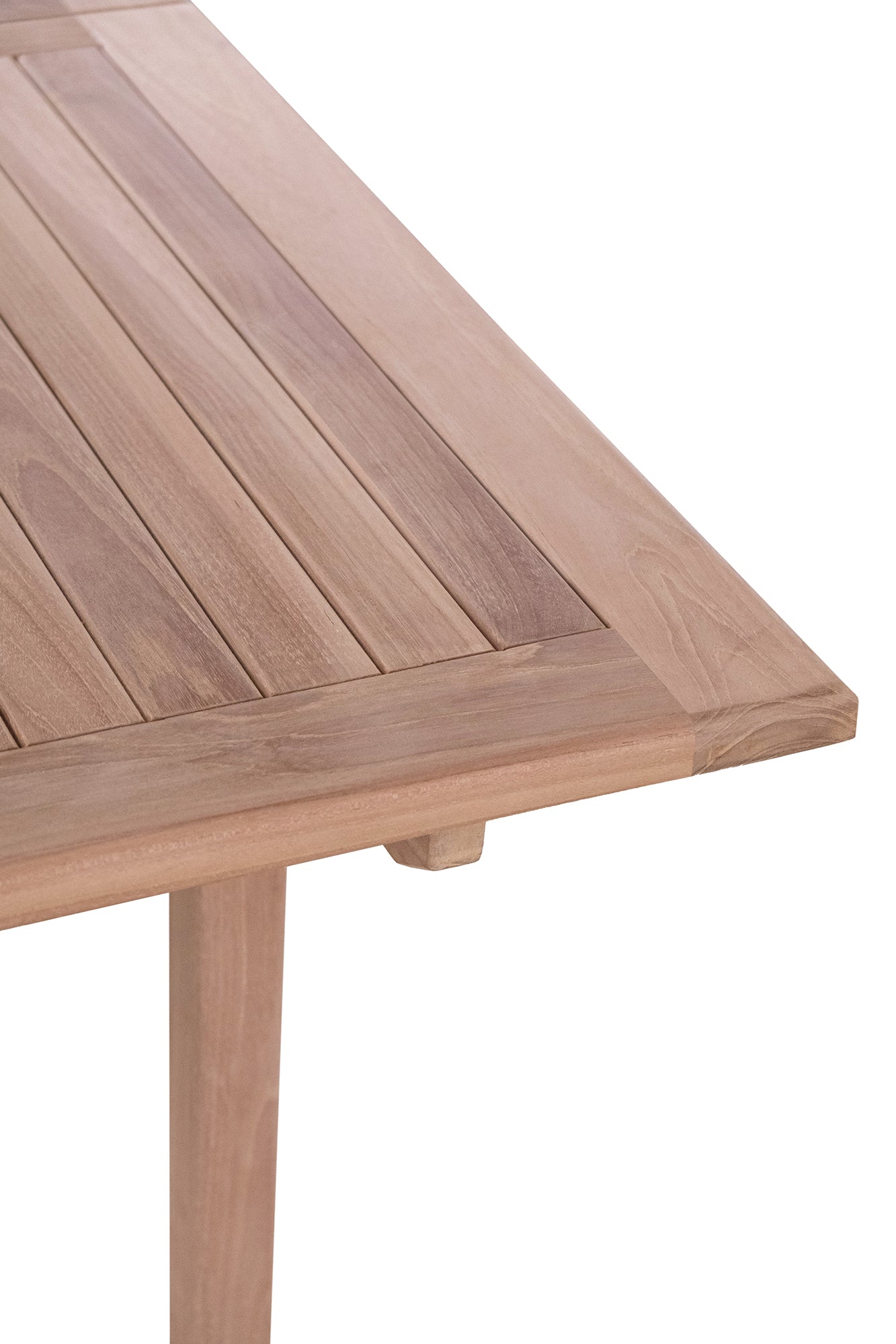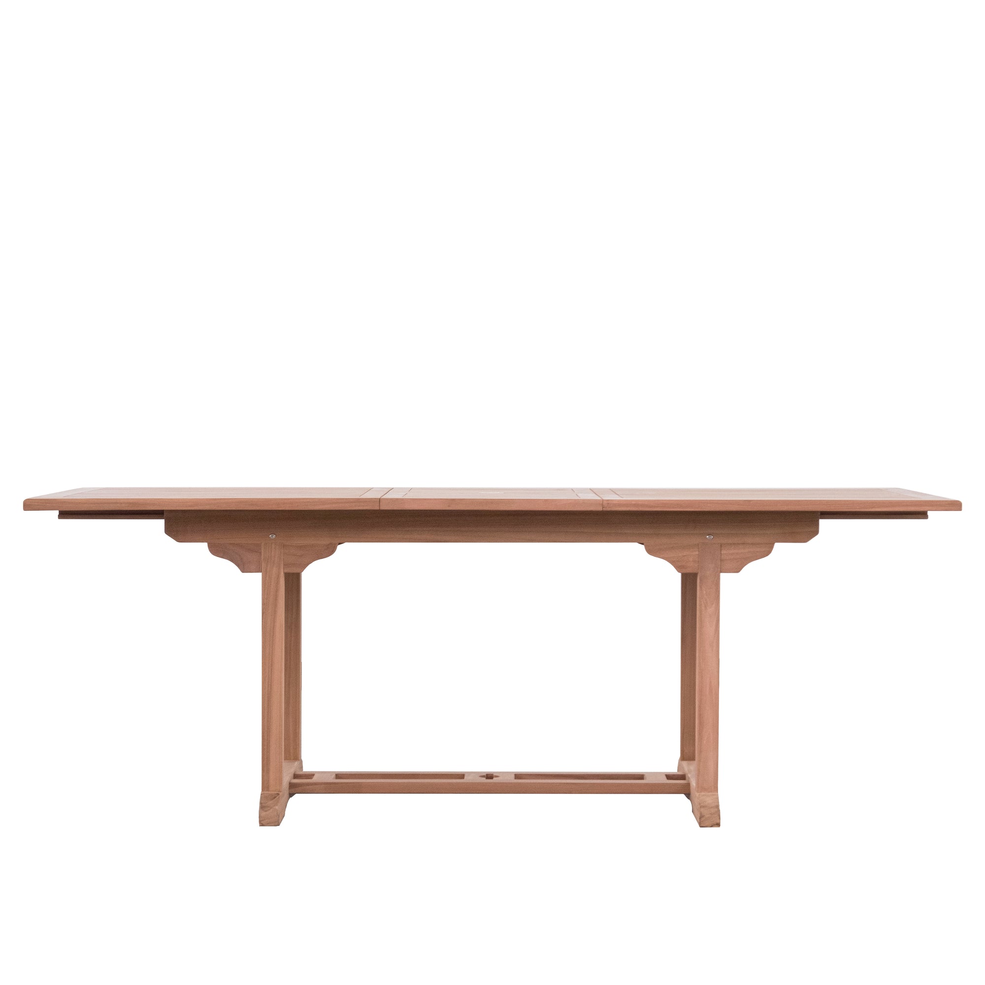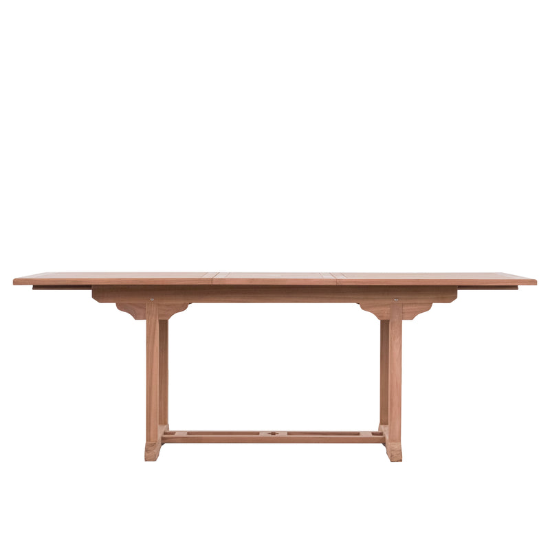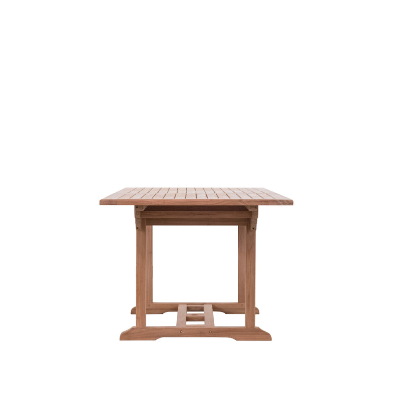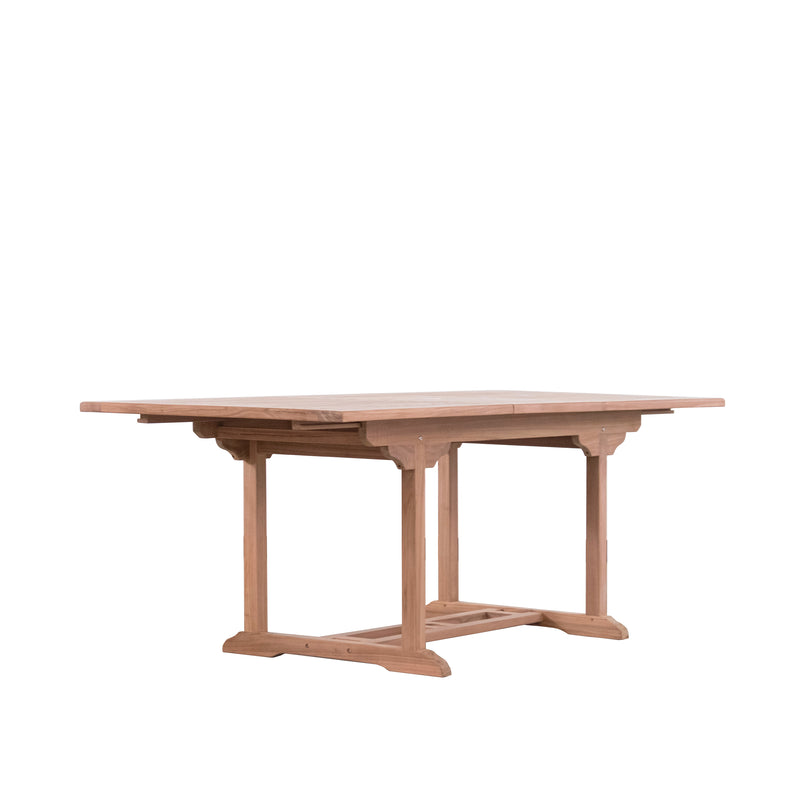 Sleek and versatile, this small extendable dining table pairs clean lines with the natural warmth of solid teak. Featuring a refined slatted tabletop and sculpted trestle legs, the design balances classic craftsmanship with a relaxed, contemporary feel. A discreet extension allows the table to expand with ease, making it ideal for both everyday dining and entertaining. Timeless and practical, it brings effortless elegance to indoor spaces and covered outdoor settings.