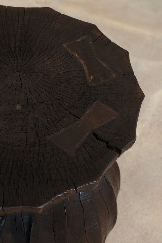 Crafted from mango wood with a sculptural, curved silhouette and a smooth round top. The carved texture and dark-stained finish highlight the natural grain and form of the timber, making each piece unique. Colours and finishes between items may vary slightly due to the natural nature of the wood.