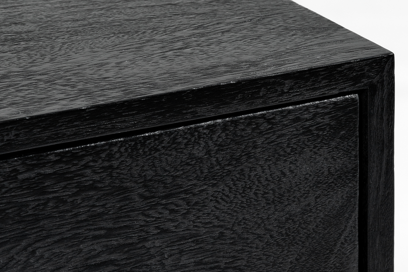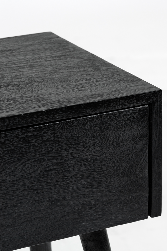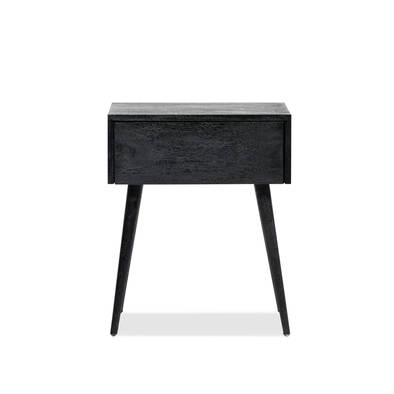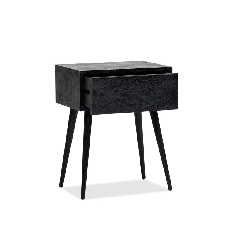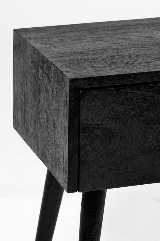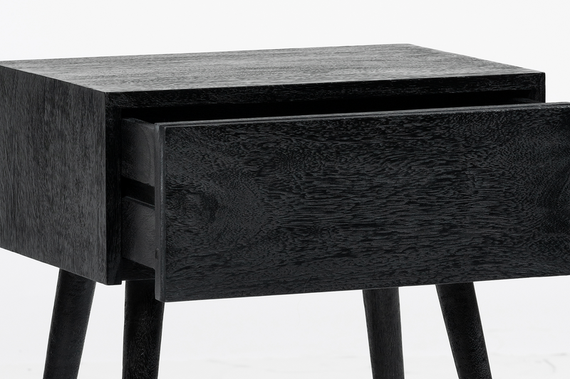 The Amsterdam bedside without shelf has one drawer with four tapered legs. Built from solid mango wood in Black finish.