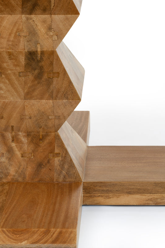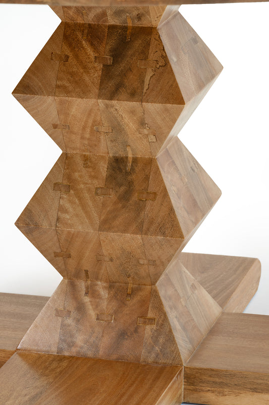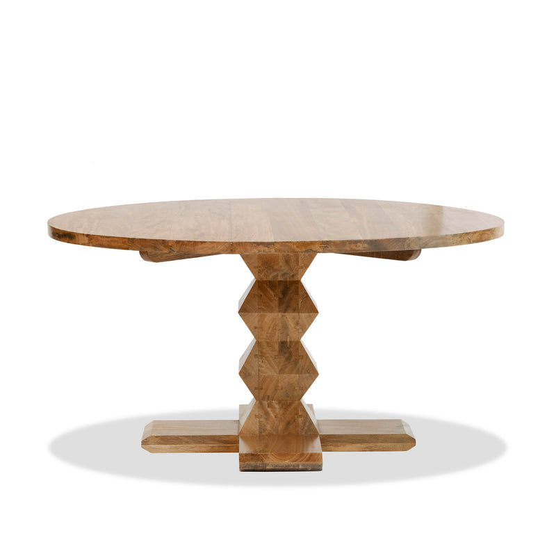 Built from solid mango wood with Natural Sealed finish. The Angus dining table has a round top with a pedestal base that has an angled diamond profile.