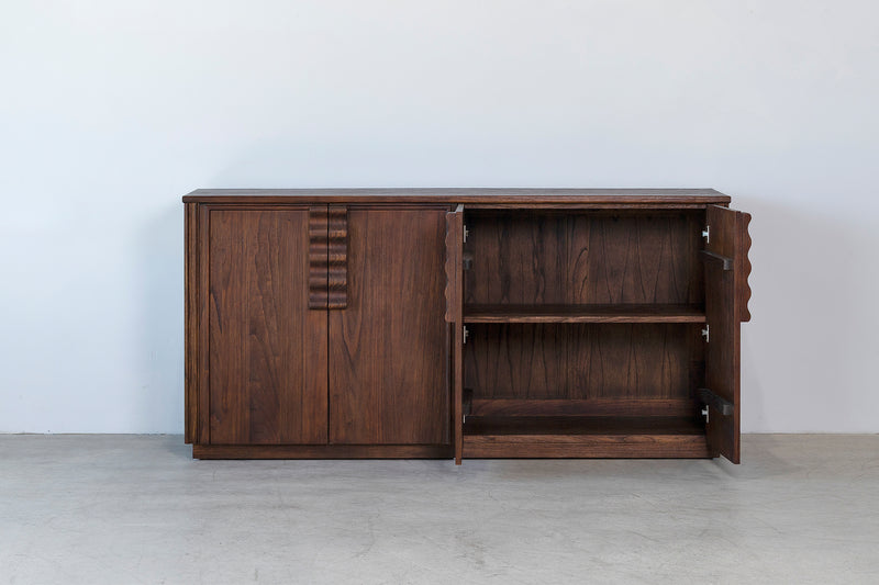 The Astoria Buffet made from solid mindi wood in an antique finish, featuring a unique undulating wooden handle, a beautifully timeless piece for any space.