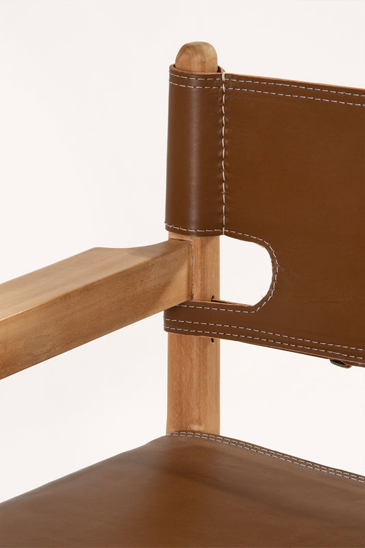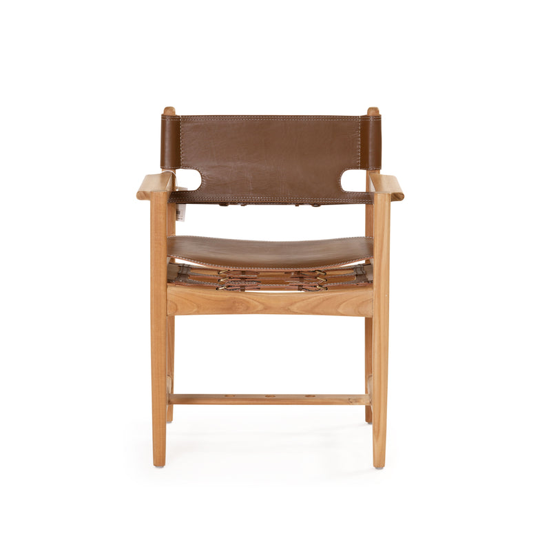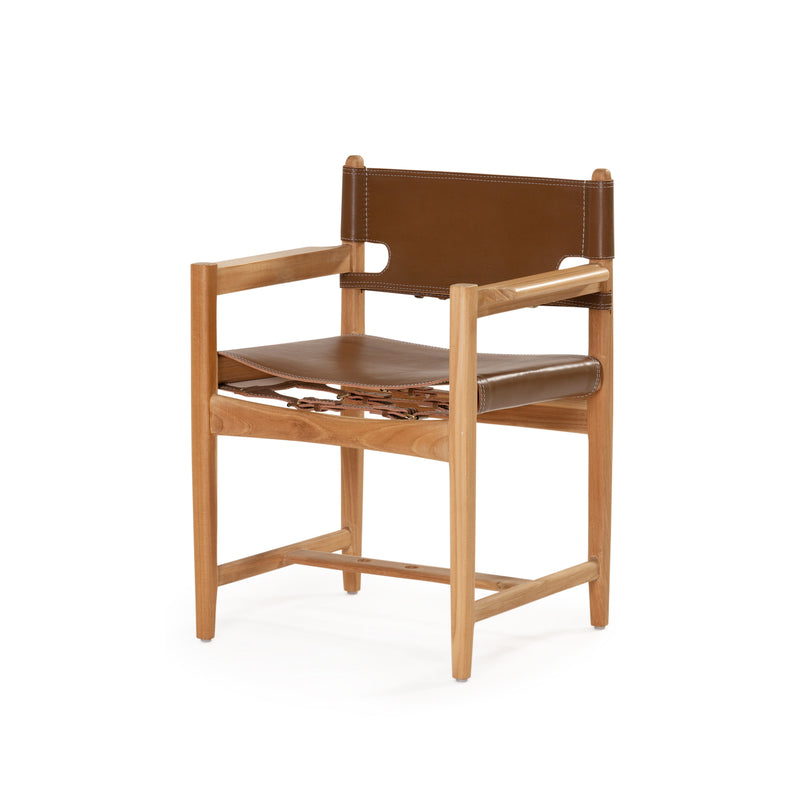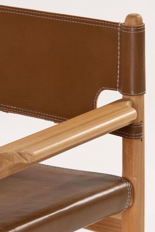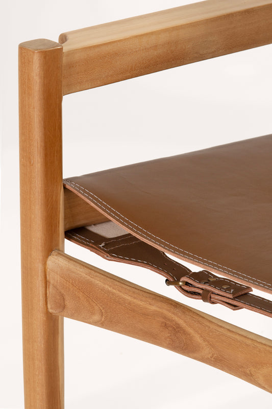 - Sustainability sourced teak hardwood frame with walnut leather back rest and seat.