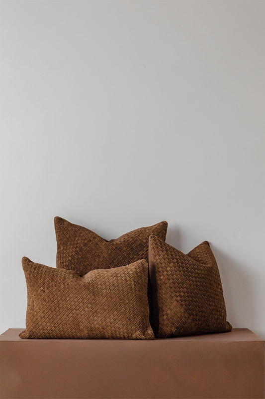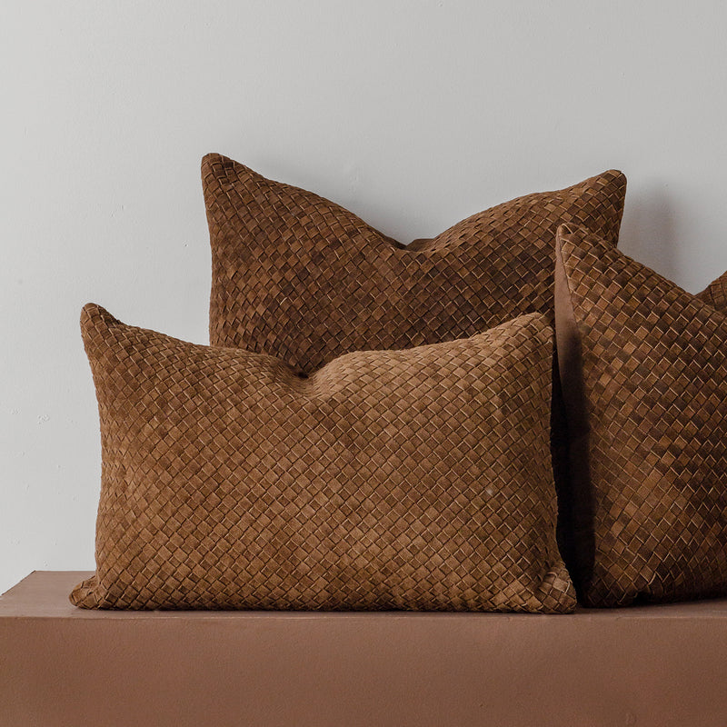 The Woven Leather cushion features a handwoven design on the front and a soft cotton backing. Available in taupe, chocolate and saddle.