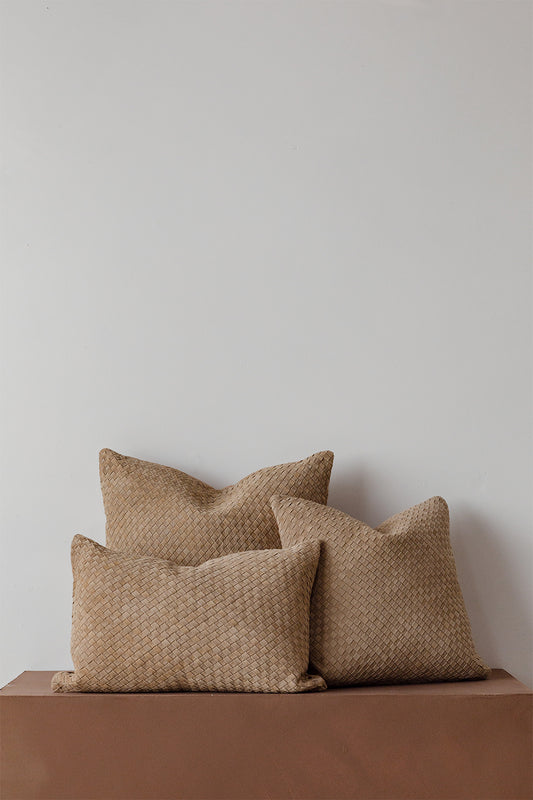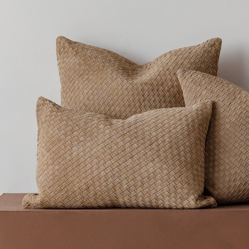 The Woven Leather cushion features a handwoven design on the front and a soft cotton backing. Available in taupe, chocolate and saddle.