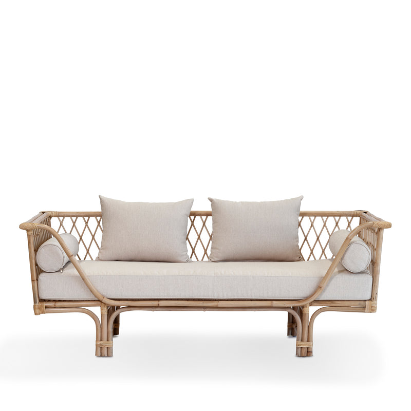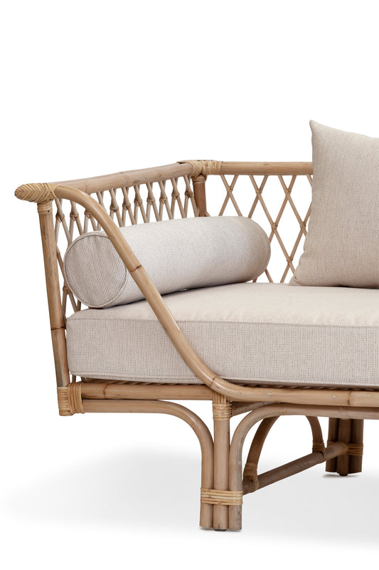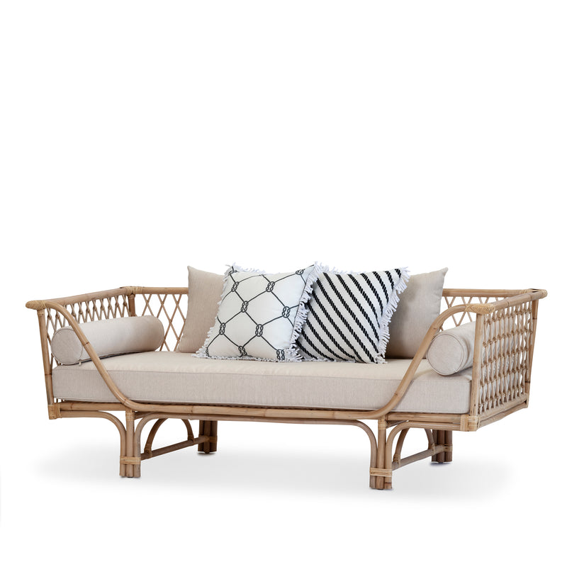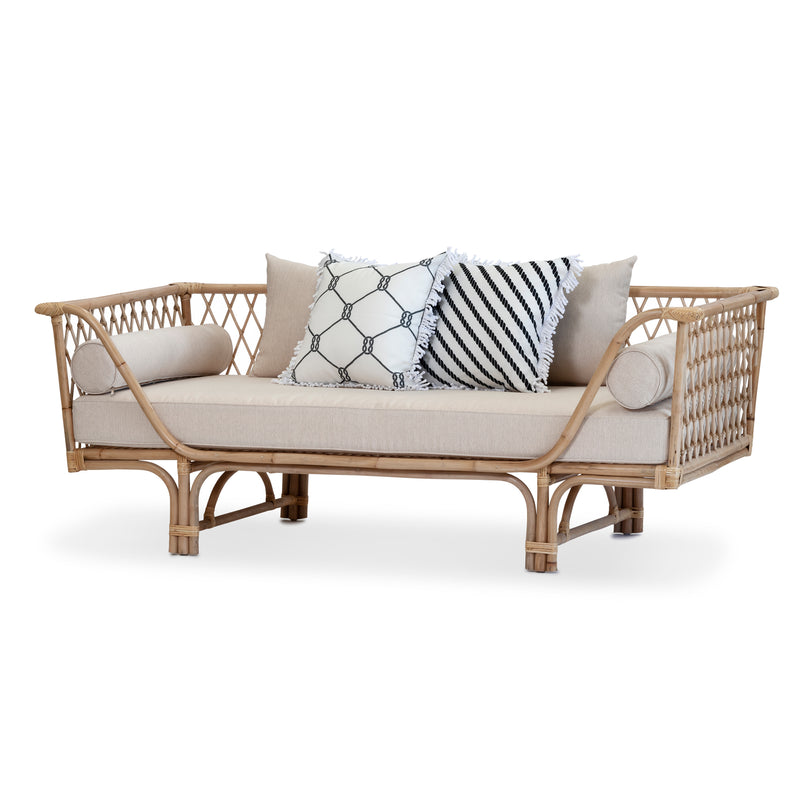 The Avalon Daybed, features a stylish and durable cane frame in natural finish and comfortable fabric cushion seat in weather proof Bahama sands upholstery. Comes with 2 x rectangular cushions and 2 x circular tube cushions.