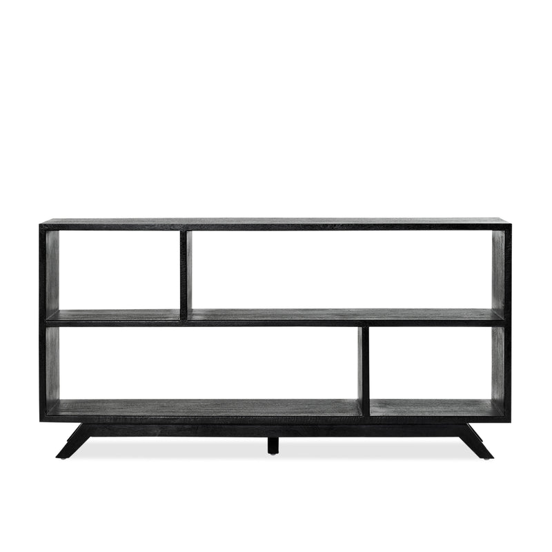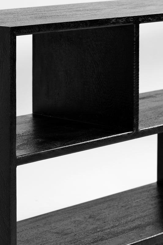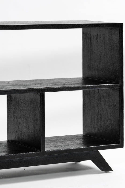Avoca bookcase or shelving unit is built from solid mango wood in Black finish. Two open shelves are divided to create four spaces for optimum storage and display.