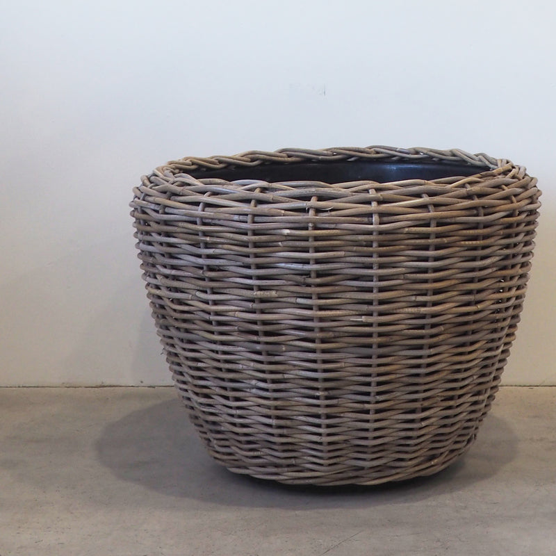 The Beatrice Bowl Basket, handwoven from strong cane rattan in grey wash finish and complete with a strong plastic inner. Unique in shape, these baskets work perfectly as a single feature or grouped in a range of sizes and styles. This rounded pot is perfect for any plant, adding a touch of rustic charm to your space.