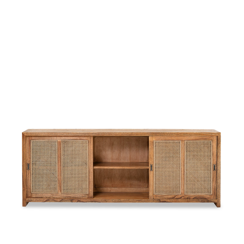 Built from mindi wood in Antique finish. Sliding doors with antique rattan inserts and solid brass handles. Image shown is the 3 Door buffet