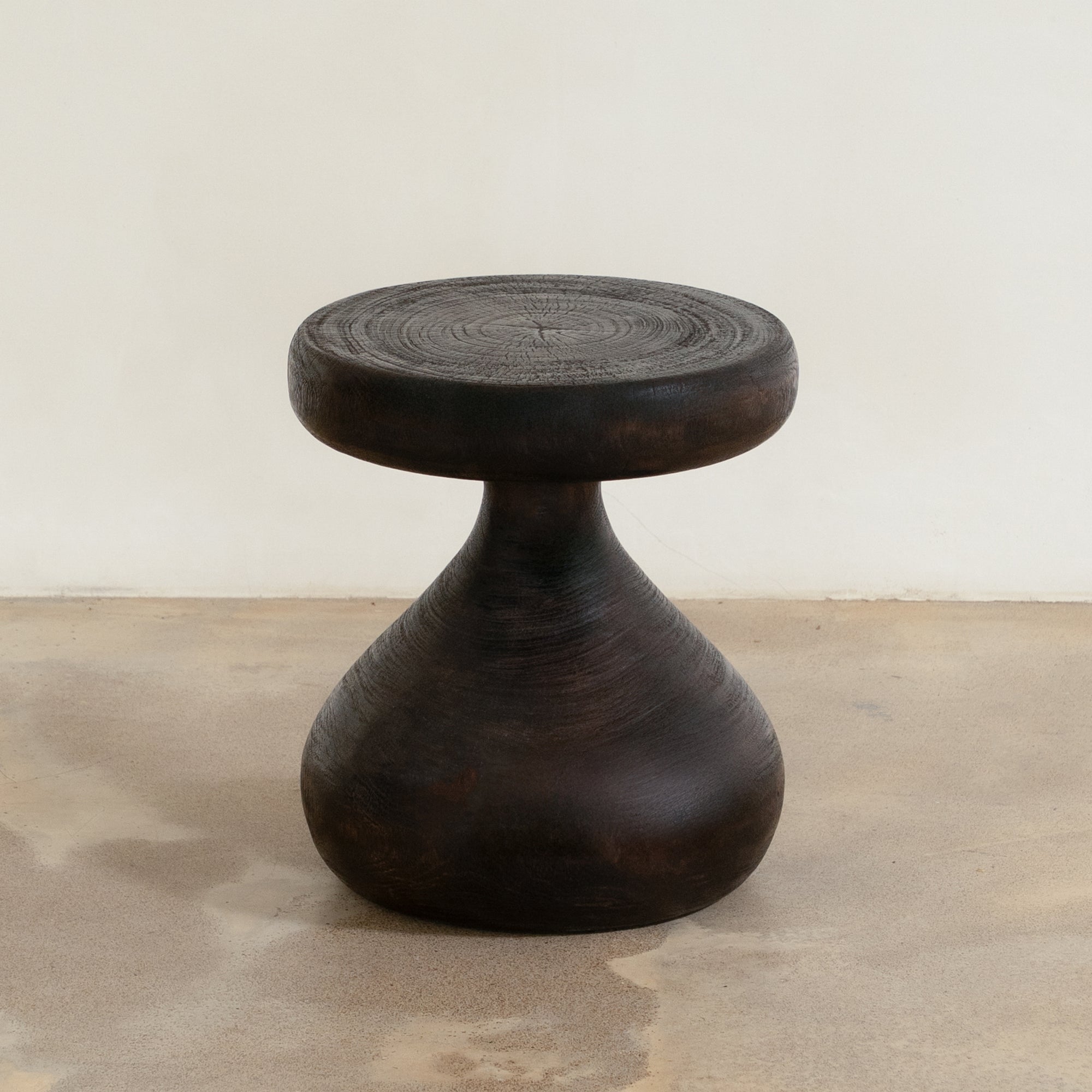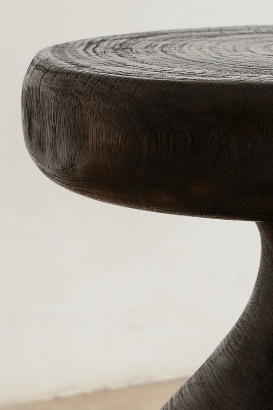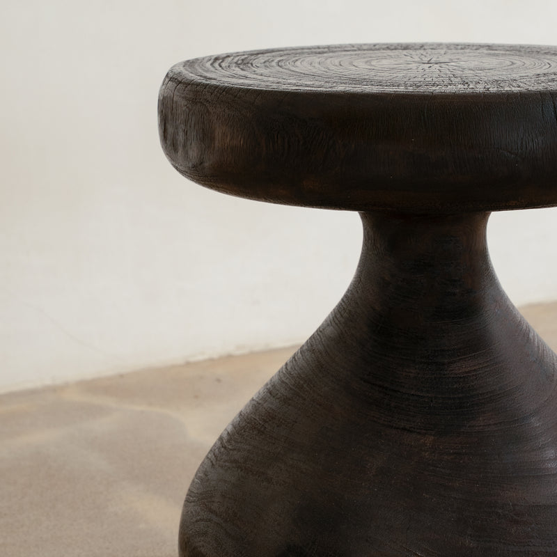 Crafted from mango wood with a rounded, sculptural base and smooth circular top. The bold form is balanced by the natural grain and dark finish, making each piece unique. Colours and finishes between items may vary slightly due to the natural nature of the wood.