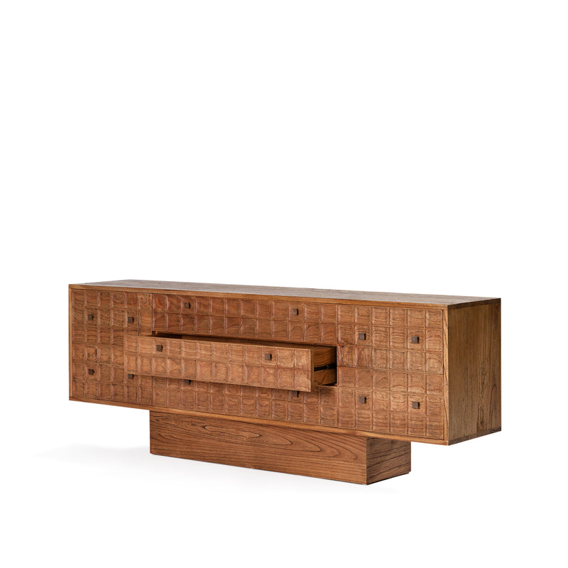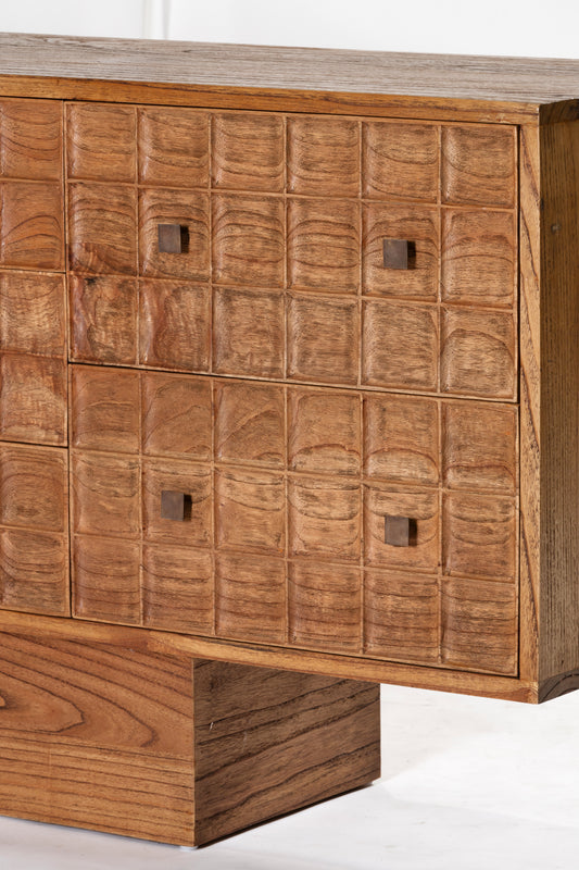 Built from solid mindi wood in an Antique finish. Featuring a beautiful hand carved geometric square pattern across its 7 drawers and solid square brass handles.