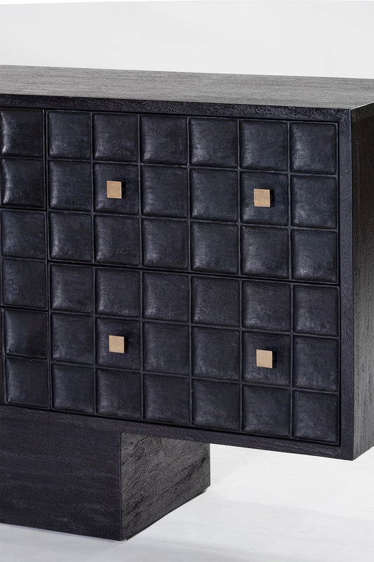 Built from solid mango wood in a Black finish. Featuring a beautiful hand carved geometric square pattern across its 7 drawers and solid square brass handles.