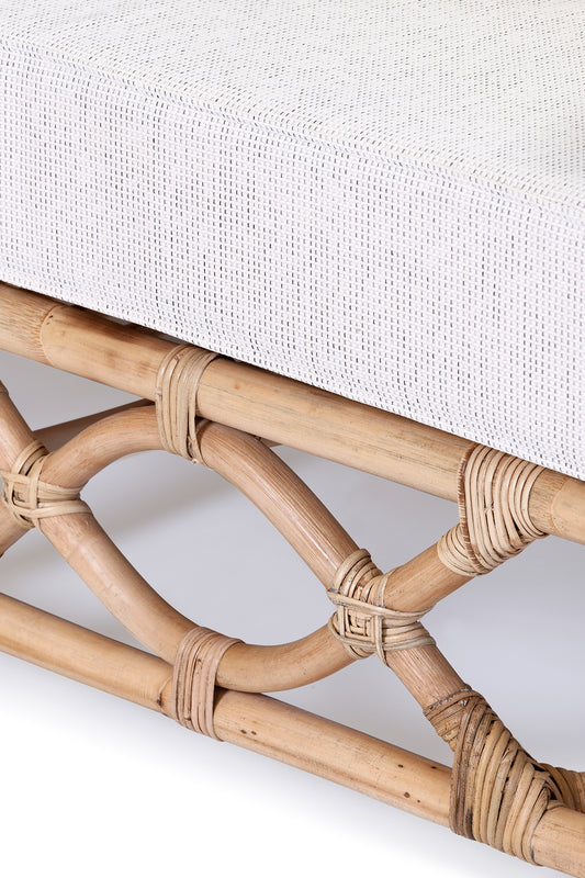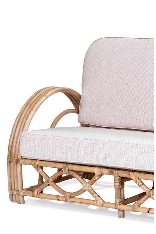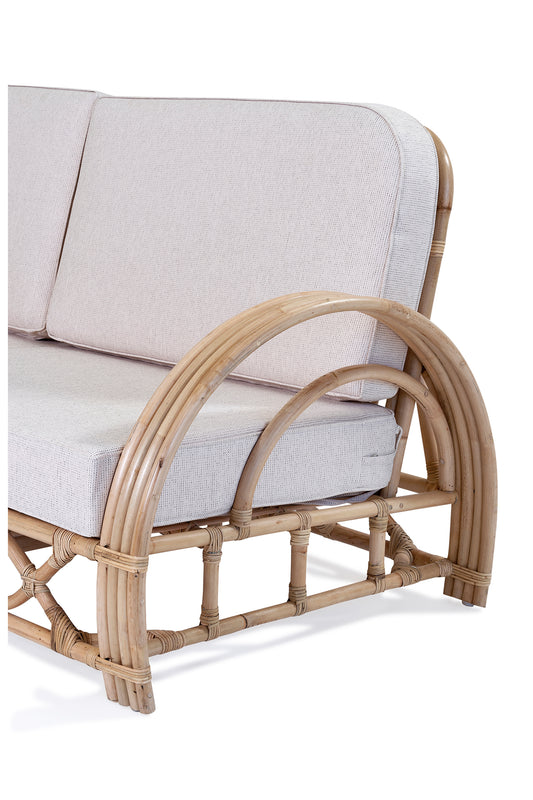 Durable cane frame sofa with detailed rattan backrest and comfortable fabric cushion seats.