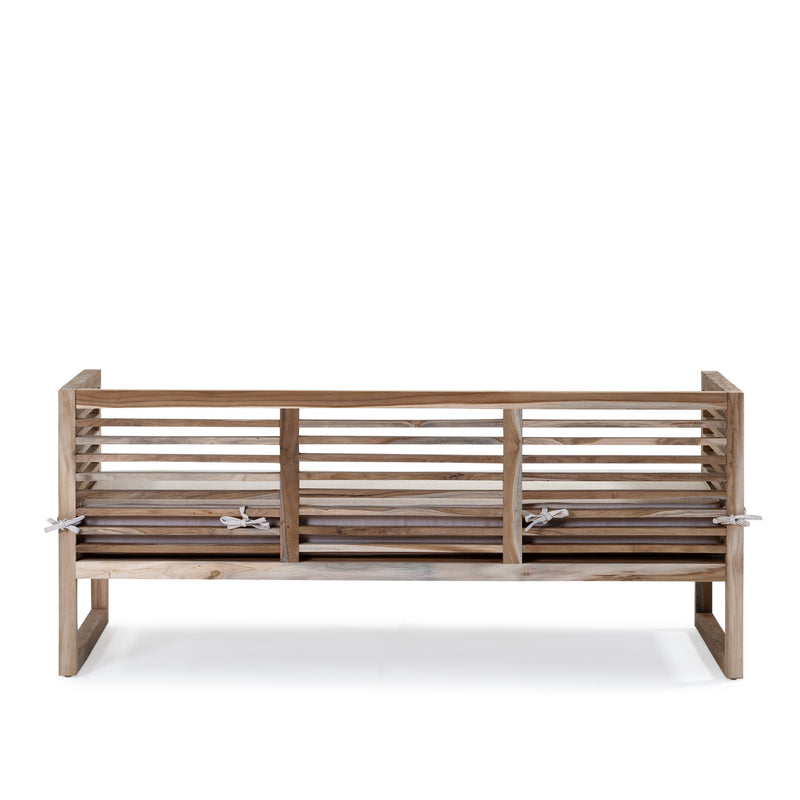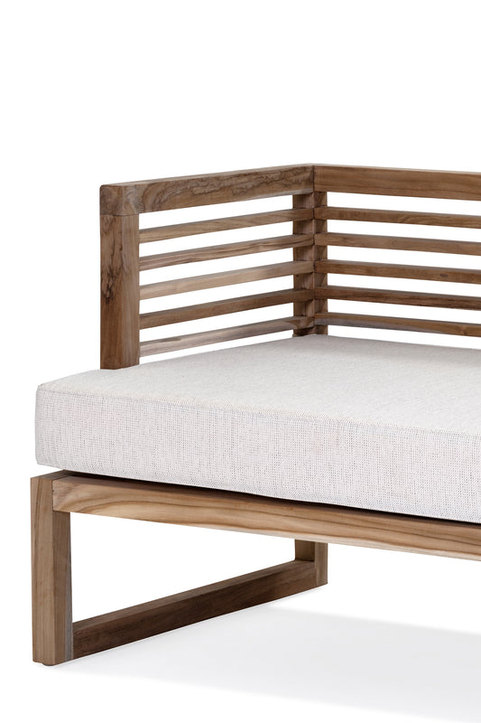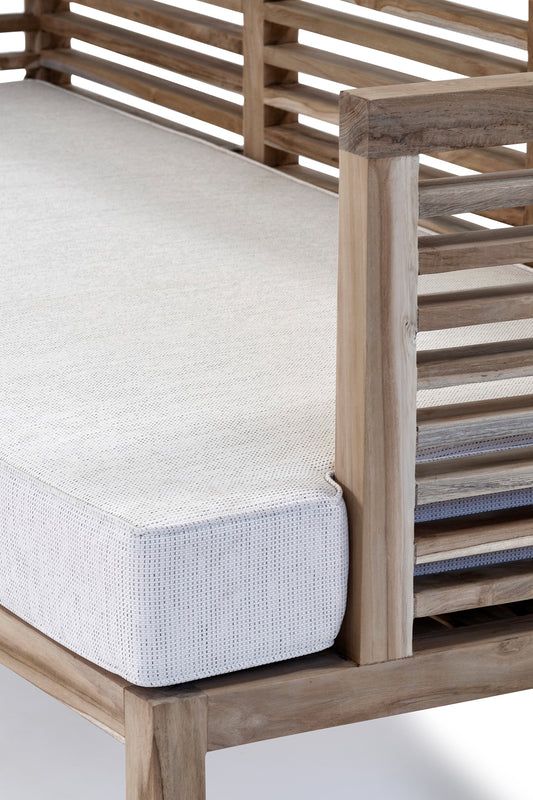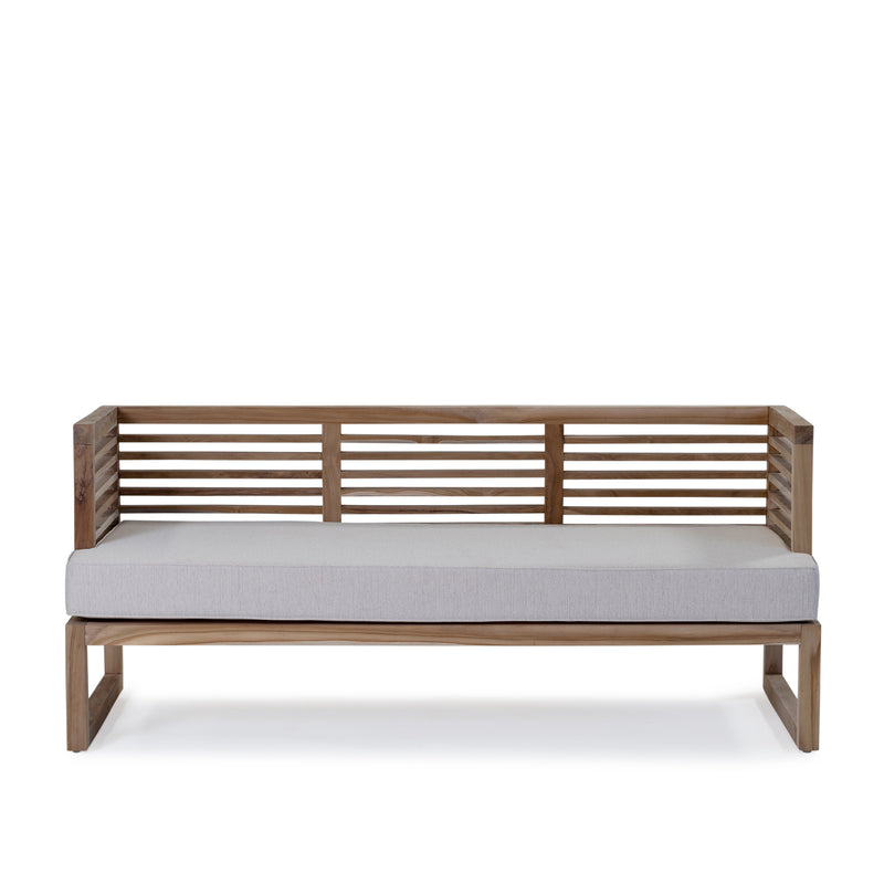 Made from teak wood in a raw finish frame, the Courtney daybed comes with a large comfortable fabric cushion seat.