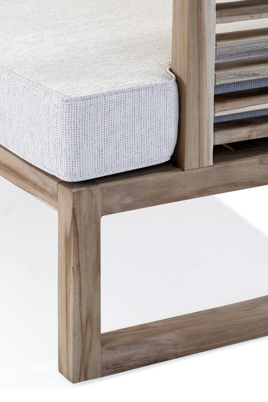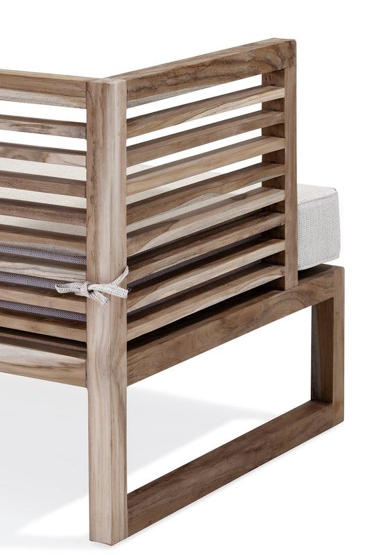 - Raw teak wood frame with Bahama sand upholstered seat cushion.