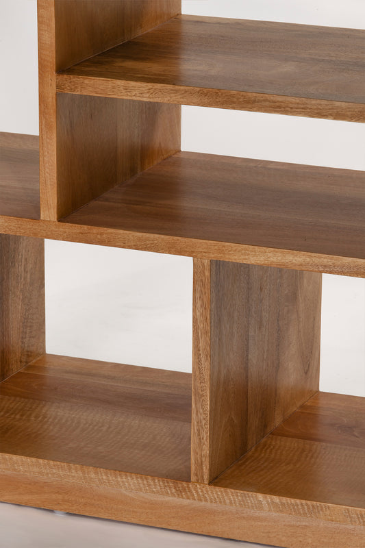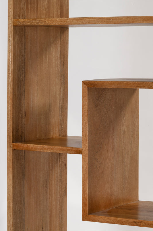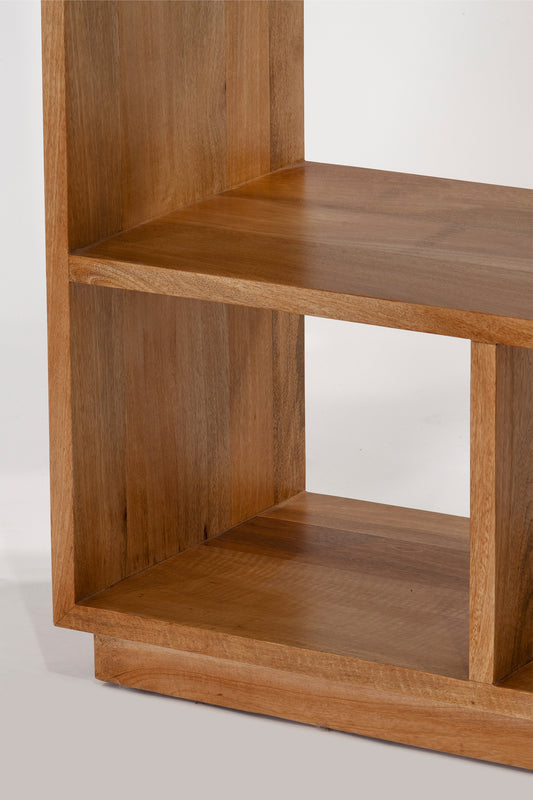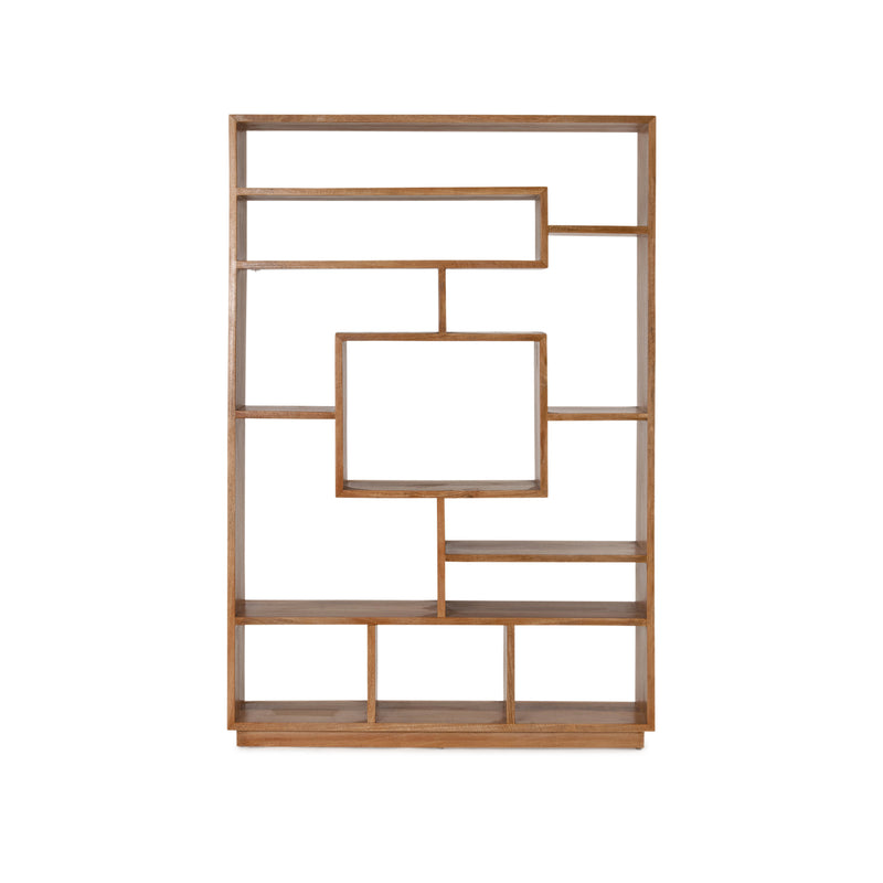 Built from solid mango wood in natural sealed finish. Tall rectangle shaped with eleven open storage compartments of varying shapes and sizes.