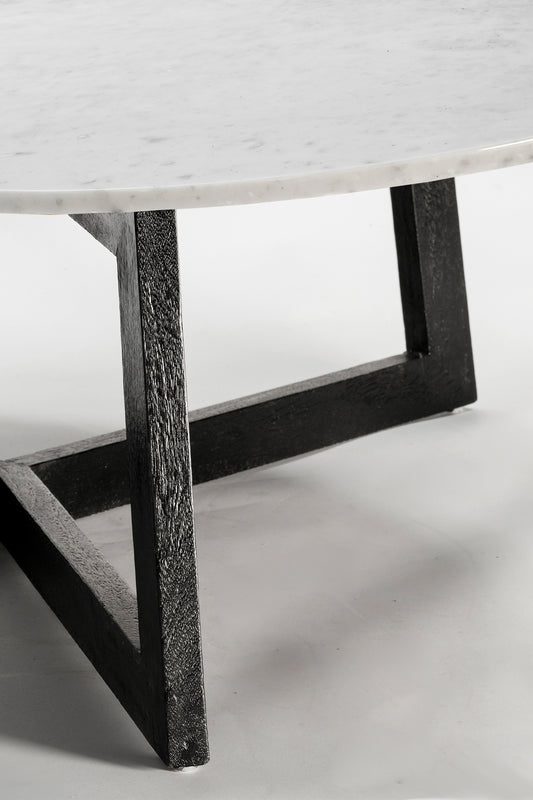 Constructed with sustainable mango wood. Solid Carrara White marble round top with angled leg base. Available with solid wood top or marble top.