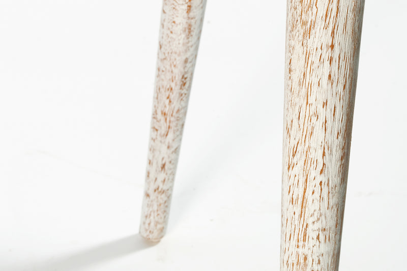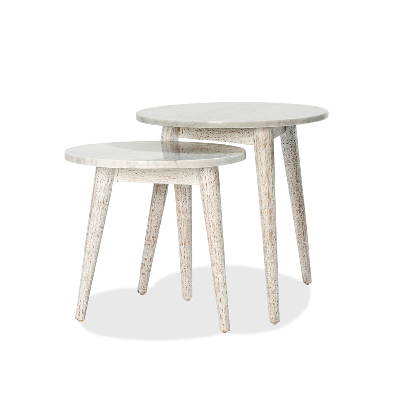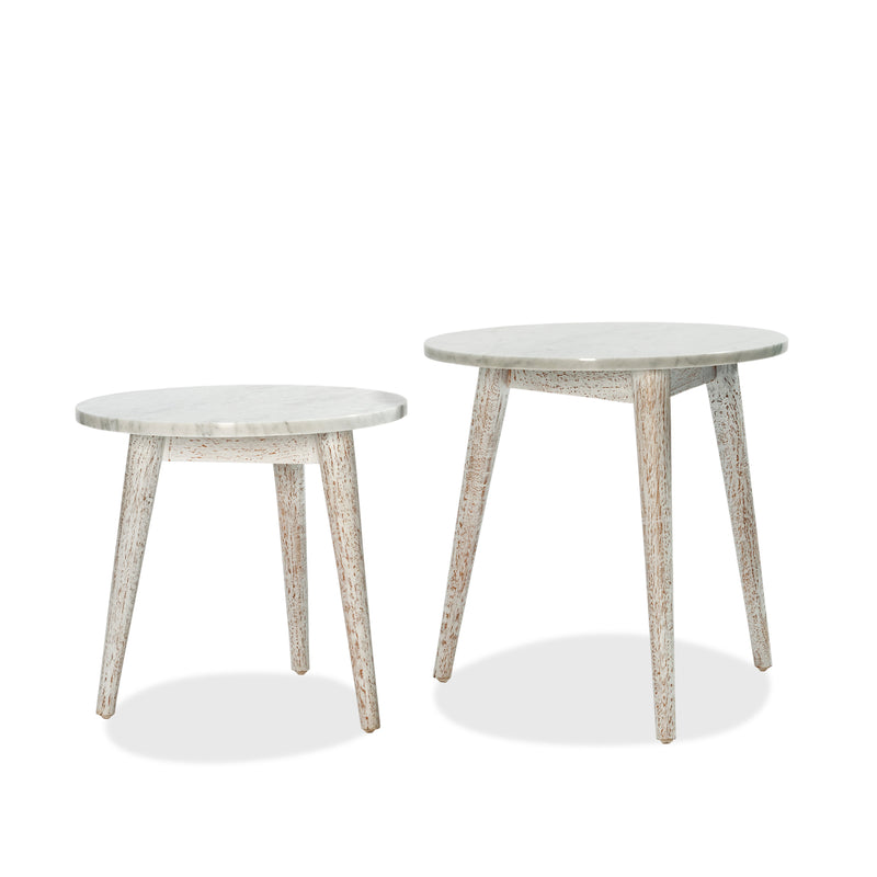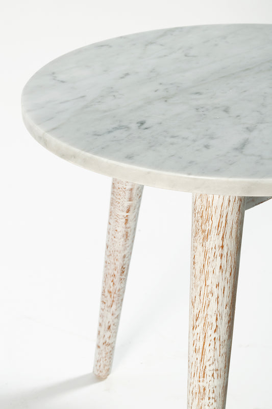 Made from mango wood with rustic white wash finish and solid Carrara white marble top. Simple design, with tapered legs and floating round marble top suitable for any living room space.
