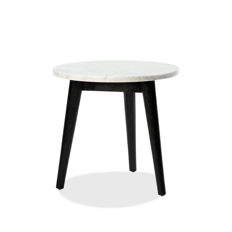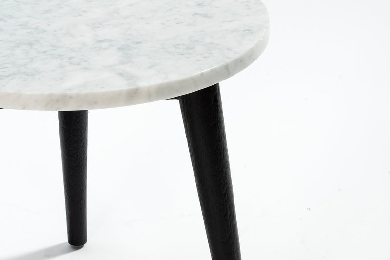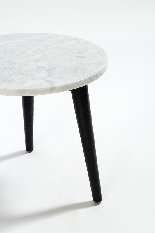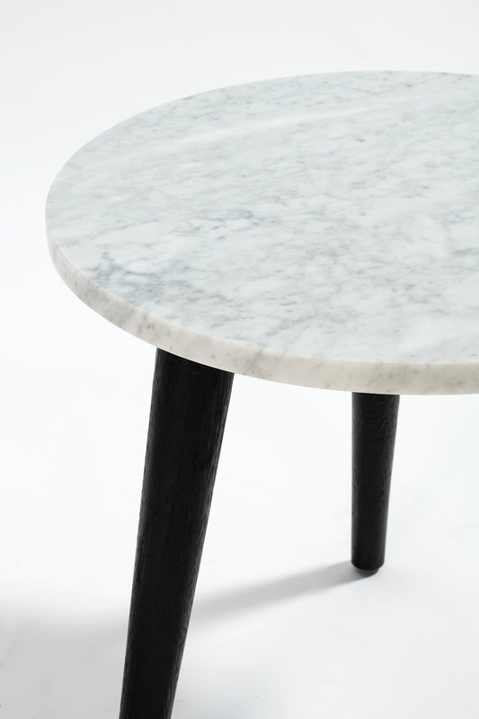Made from mango wood with Black finish and solid Carrara white marble top. Simple design, with tapered legs and floating round marble top, available in two sizes.