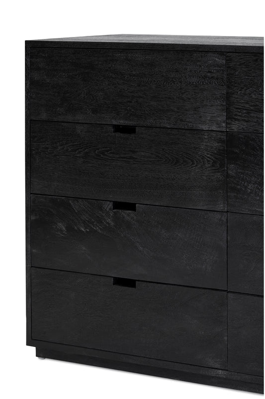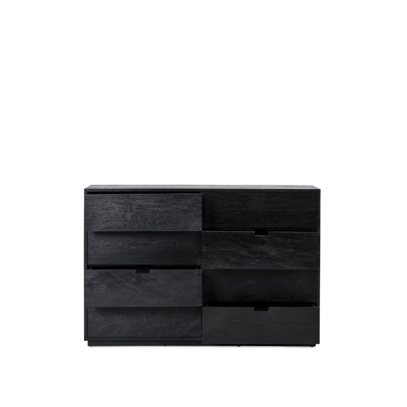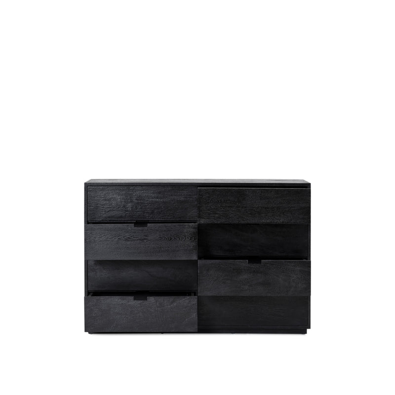 Made from mango wood, Black finish with large solid sliding drawers with cut out handle. Pictured is the Domo 4x2 (four drawers high and two drawers wide) Please enquire for further configuration options.