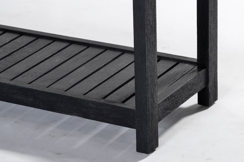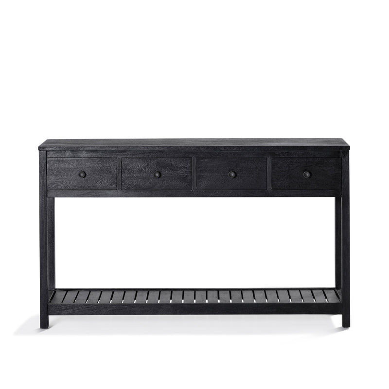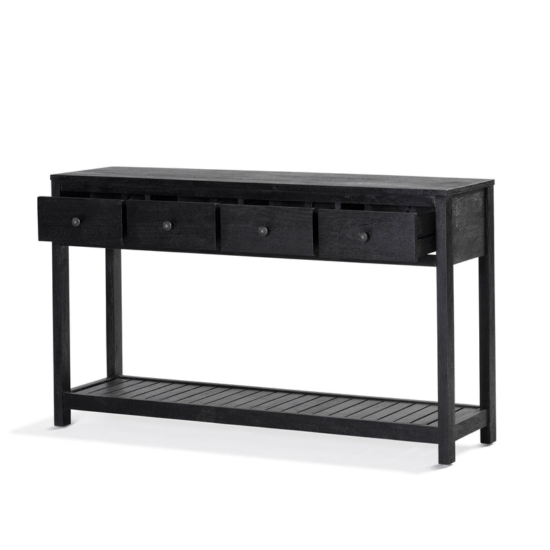 Functional four drawer console with solid brass handles and a low slatted shelf, built from mango wood in a black finish.