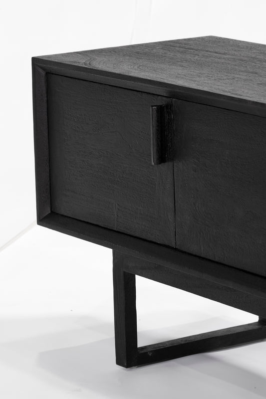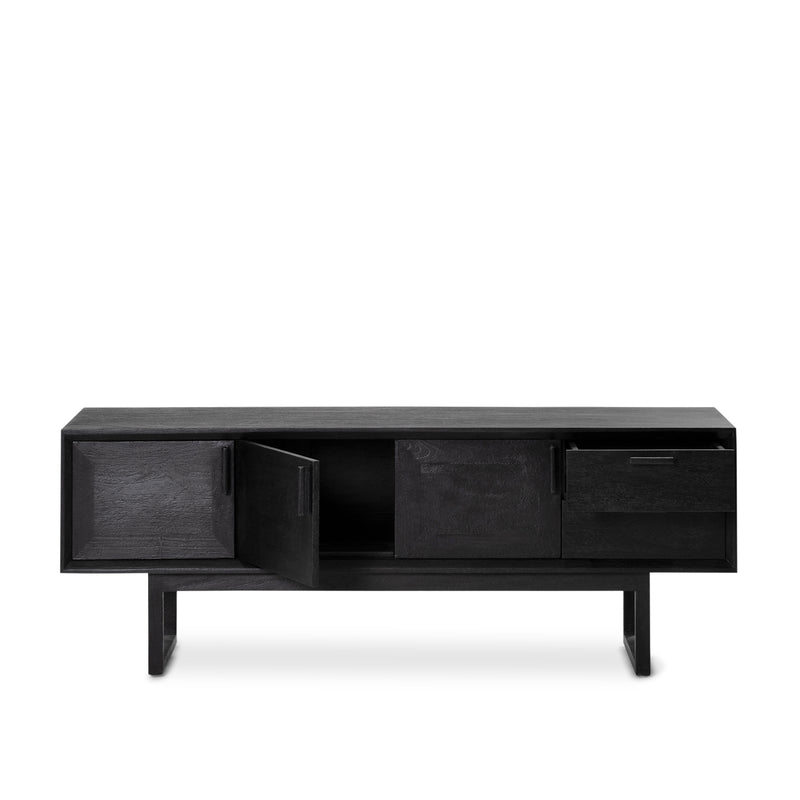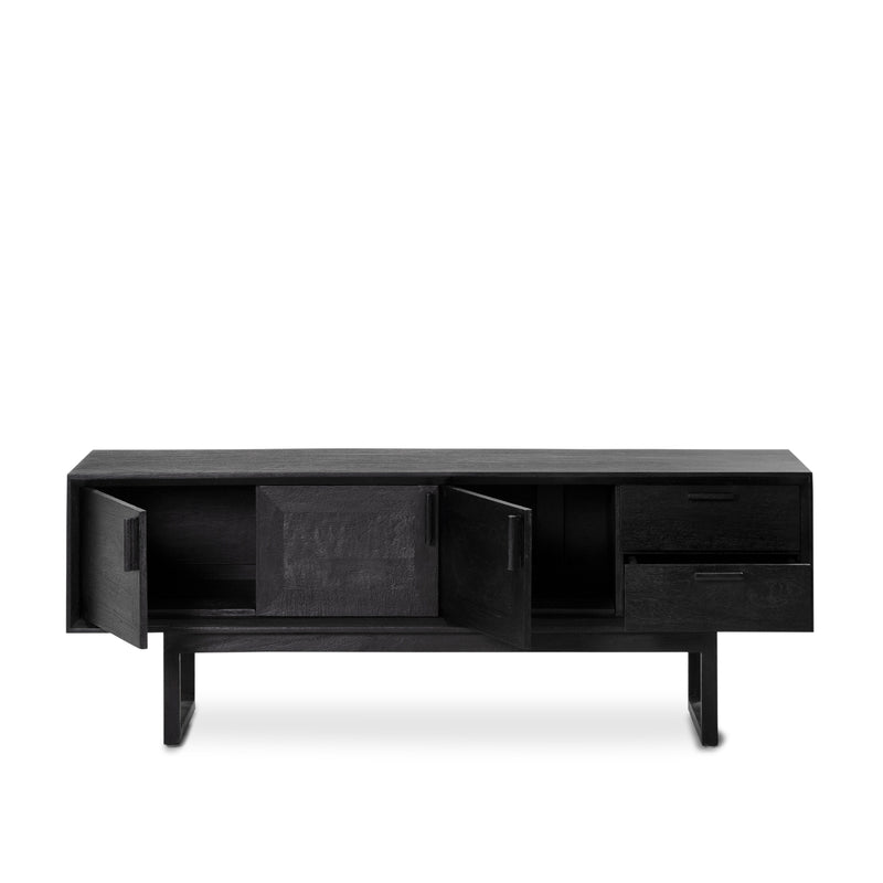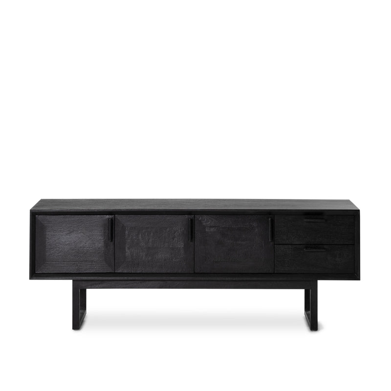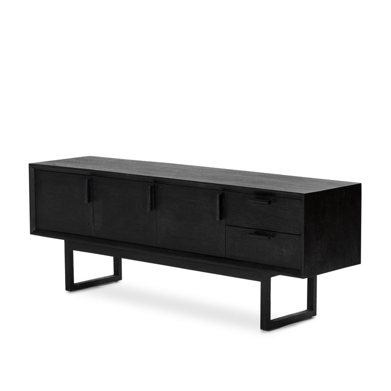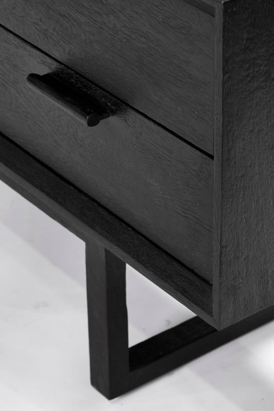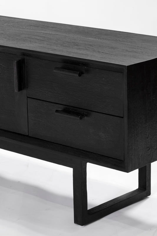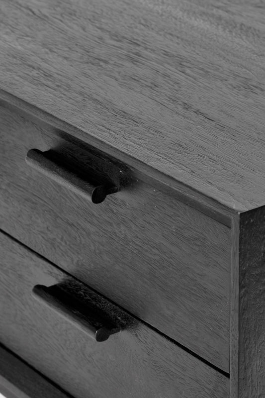 Made from mango wood with a black finish. Ample storage, with three cupboards and two sliding drawers, each with hand constructed wooden handles.