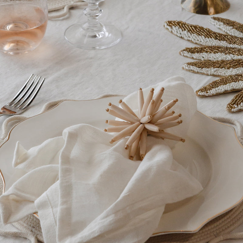 Handcrafted with exquisite beaded glass on cotton, every placemat, runner, and napkin ring boasts one-of-a-kind craftsmanship, featuring intricate patterns that sparkle and elevate your holiday meals. Perfect for layering, the Fiore napkin ring adds warmth, charm, and a touch of elegance to your table.