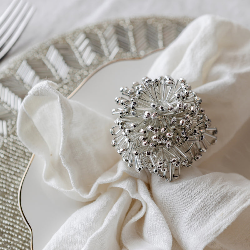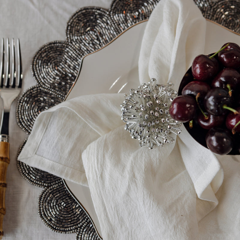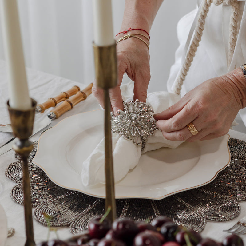 Handcrafted with exquisite beaded glass on cotton, every placemat, runner, and napkin ring boasts one-of-a-kind craftsmanship, featuring intricate patterns that sparkle and elevate your holiday meals. Perfect for layering, the Fiore napkin ring adds warmth, charm, and a touch of elegance to your table.