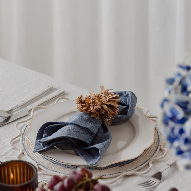 Handcrafted with exquisite beaded glass on cotton, every placemat, runner, and napkin ring boasts one-of-a-kind craftsmanship, featuring intricate patterns that sparkle and elevate your holiday meals. Perfect for layering, the Fiore napkin ring adds warmth, charm, and a touch of elegance to your table.