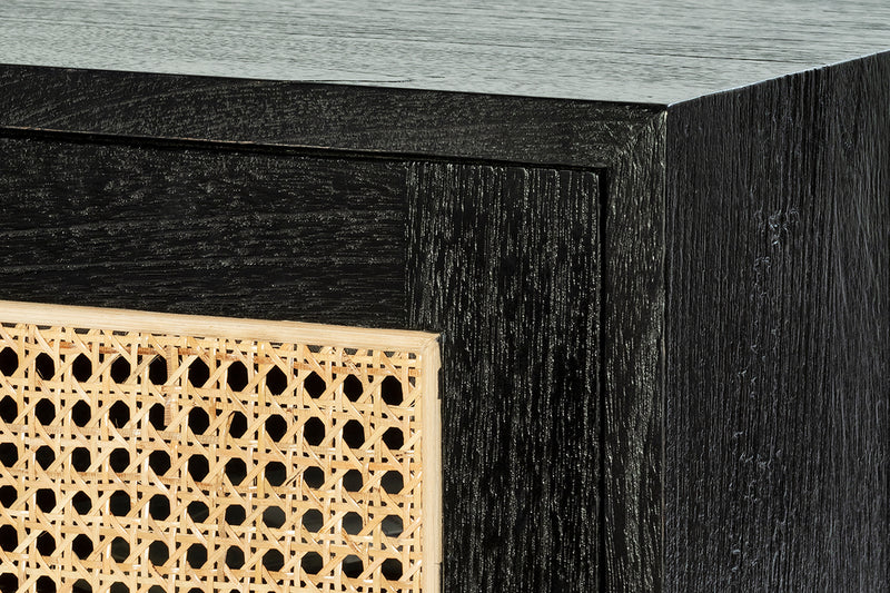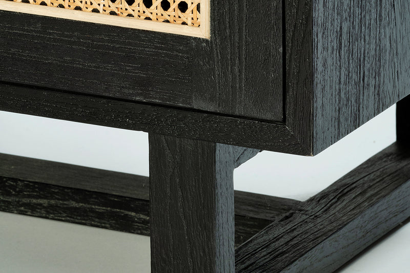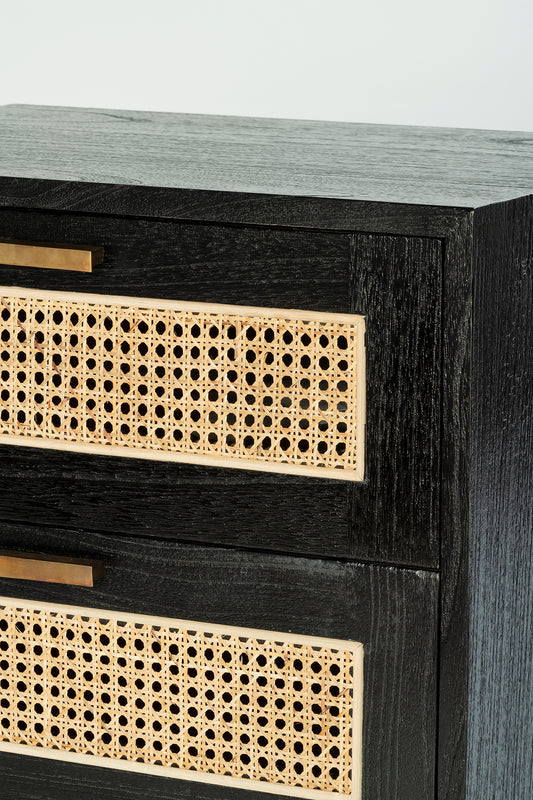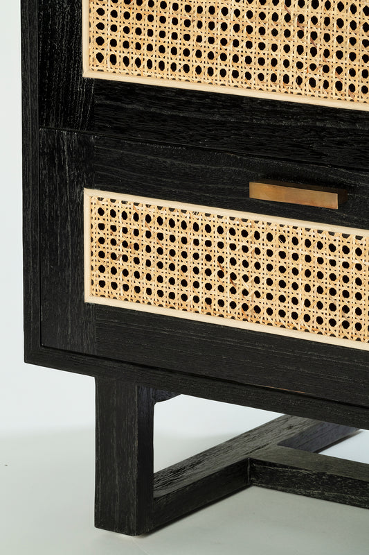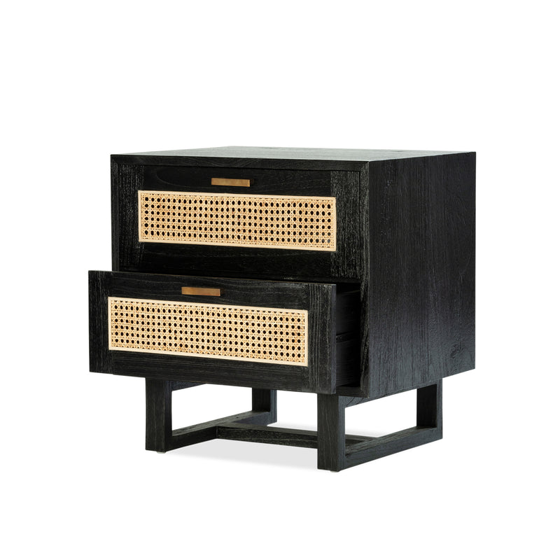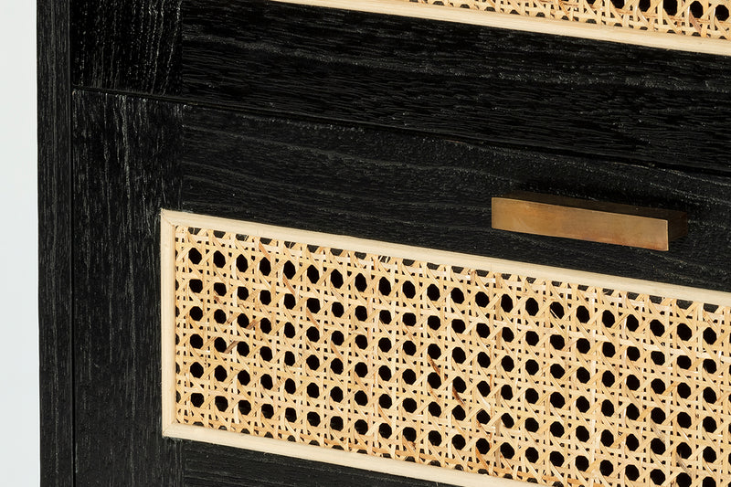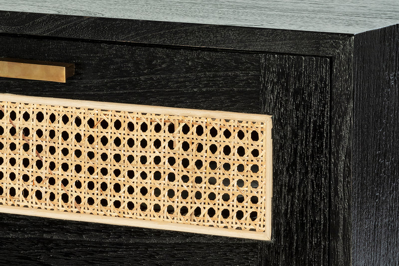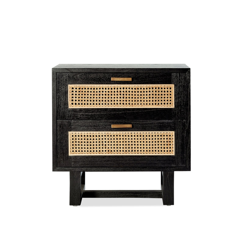 Built from mango wood in a Black finish. Two large storage drawers with natural rattan inserts and solid brass handles. Shop the look here.