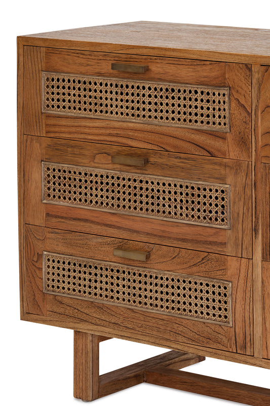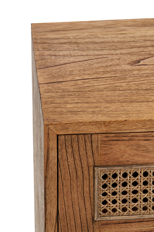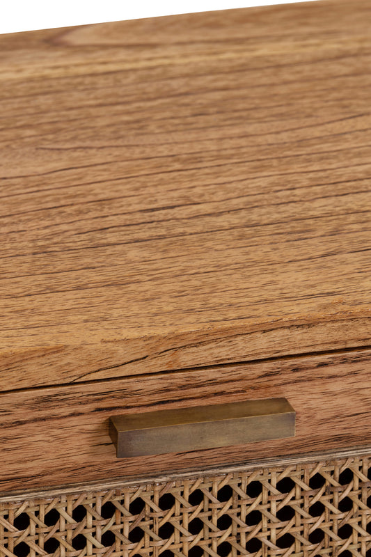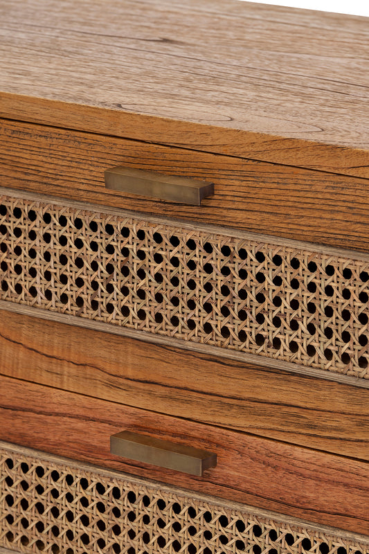 - Mindi wood, antique finish and antique rattan drawers. Hafele superior German engineered hardware, soft drawer runners.