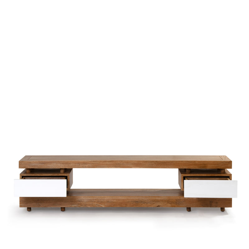 Made from mango wood, Natural Sealed finish with white drawers. Featuring a long flat open surface and solid straight legs on both ends for maximum support.