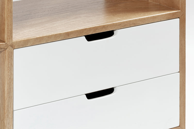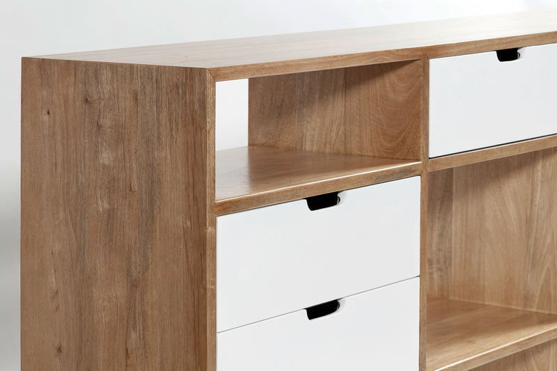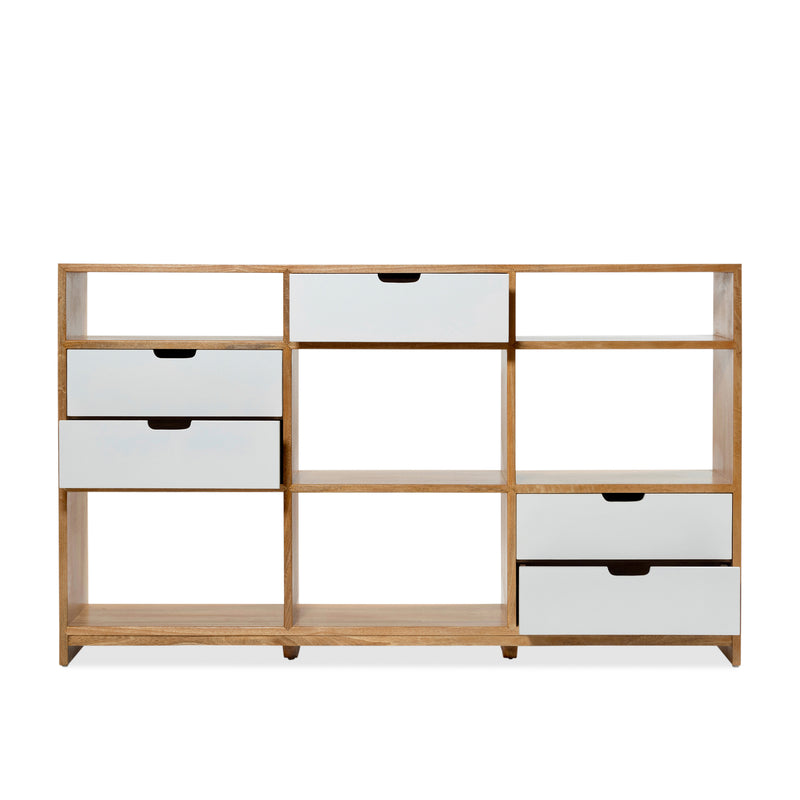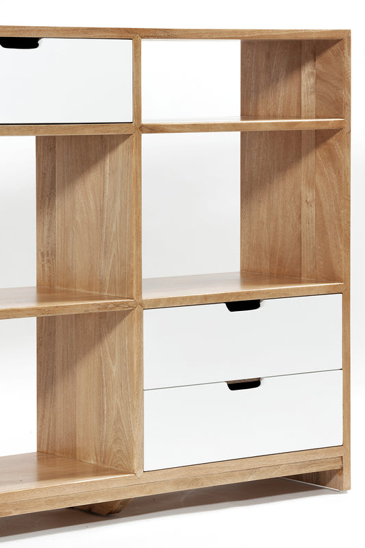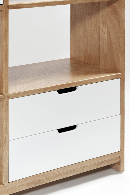 The florida half triple bookcase is built from solid mango wood in Natural Sealed finish with white drawers. The bookcase is divided into three columns with a total of 6 drawers and 6 open shelves.