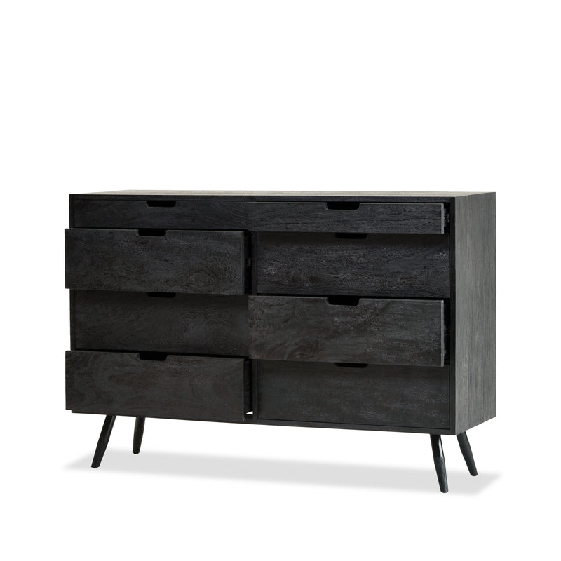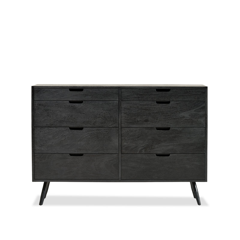 The graduated chest is made from mango wood in a Black finish. This eight drawer chest with cut out handles has four shallow drawers stacked on top of four deep drawers.