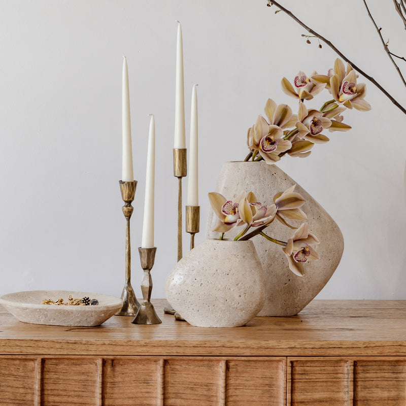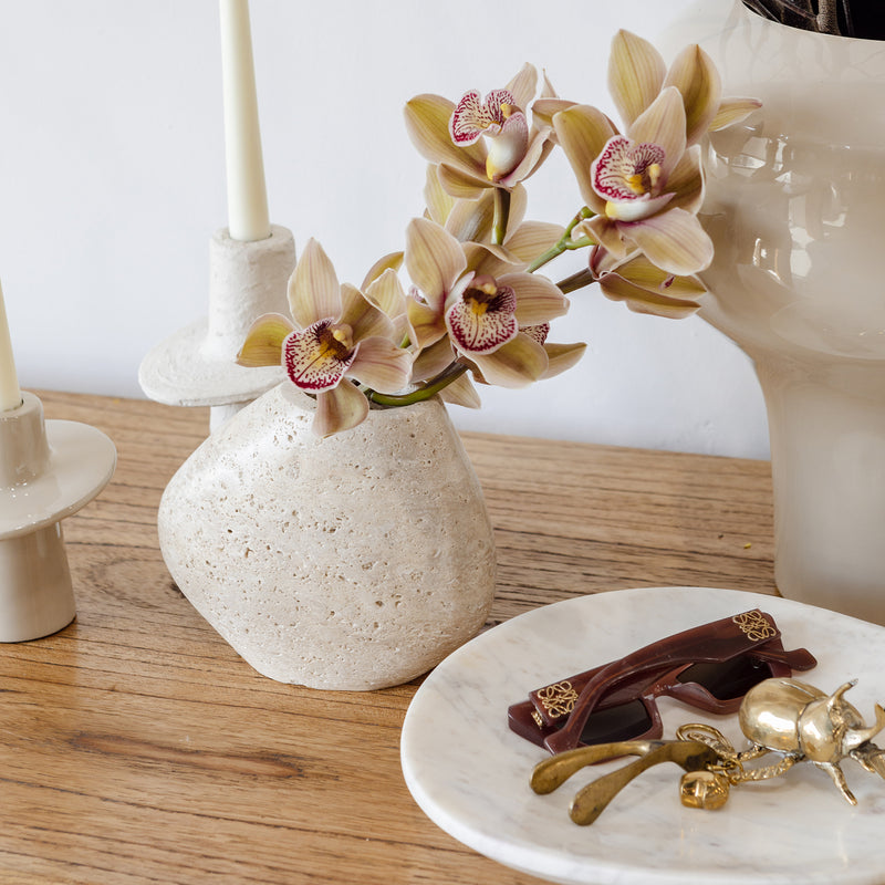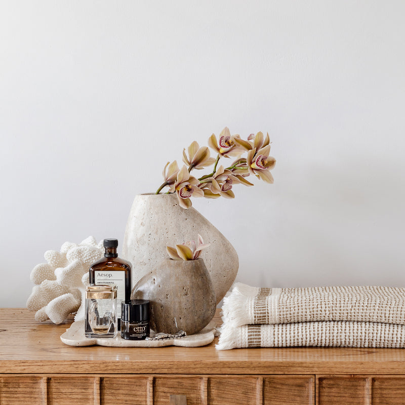 Elevate your home decor with the Hawk Travertine Vase, a true statement piece that marries natural beauty with modern design. Looking beautiful in any home, even when empty.
