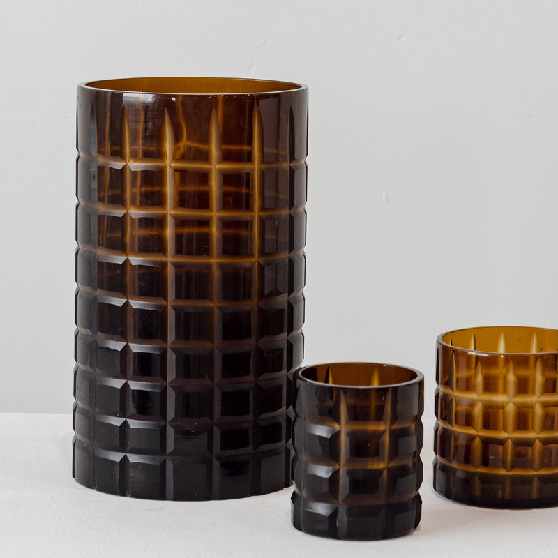 Our Kei Votives are perfect to bring modern style to your home. Crafted with fused brown glass, they features vertical and horizontal textural stripes. Enjoy them with your favourite tea lights or with a floral arrangement.