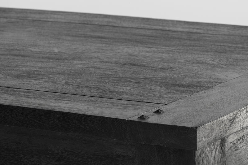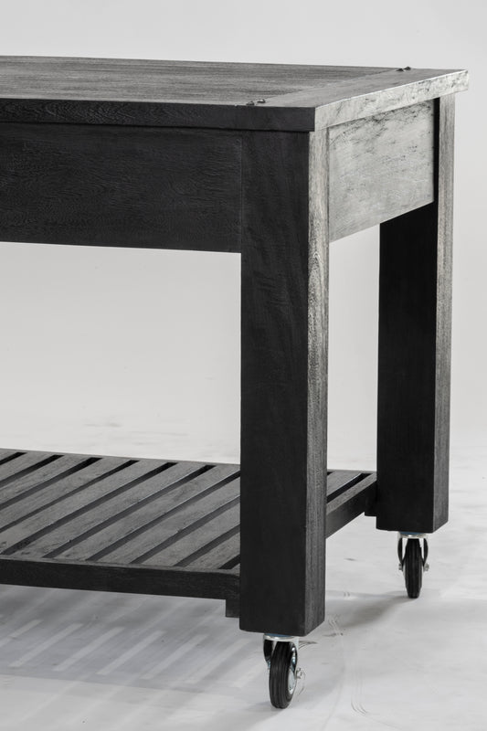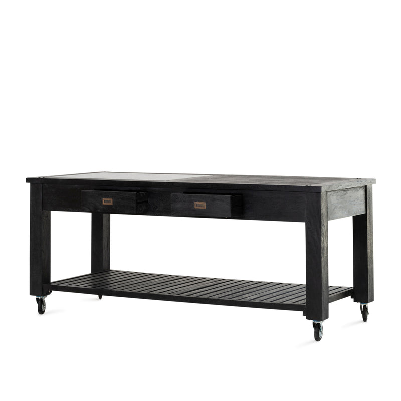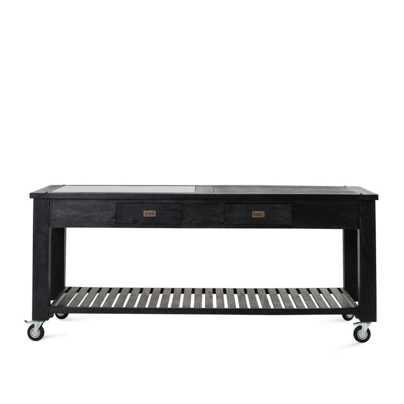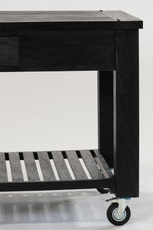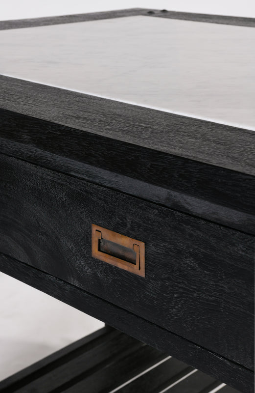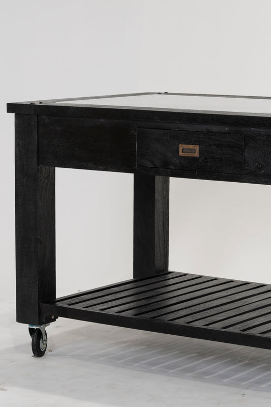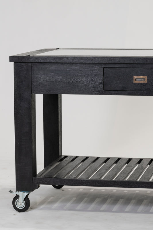 A modern and versatile kitchen island bench made from solid mango wood in black finish with half white marble insert. Featuring four drawers on either side with brass handles and slatted underneath bench. Comes complete with castors for easy manoeuvring that can be easily put on or removed.