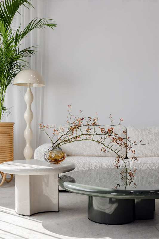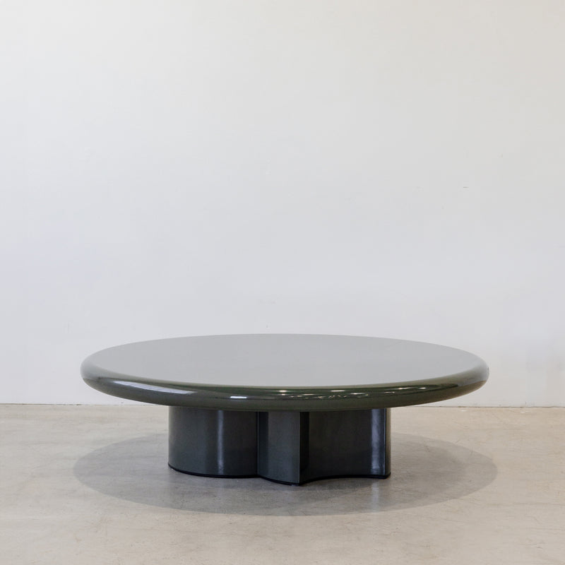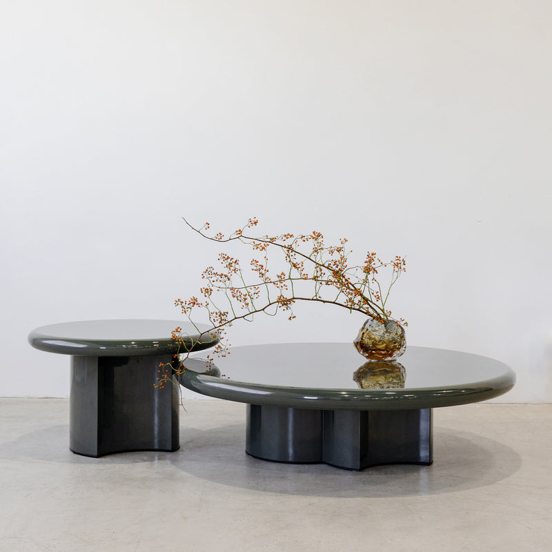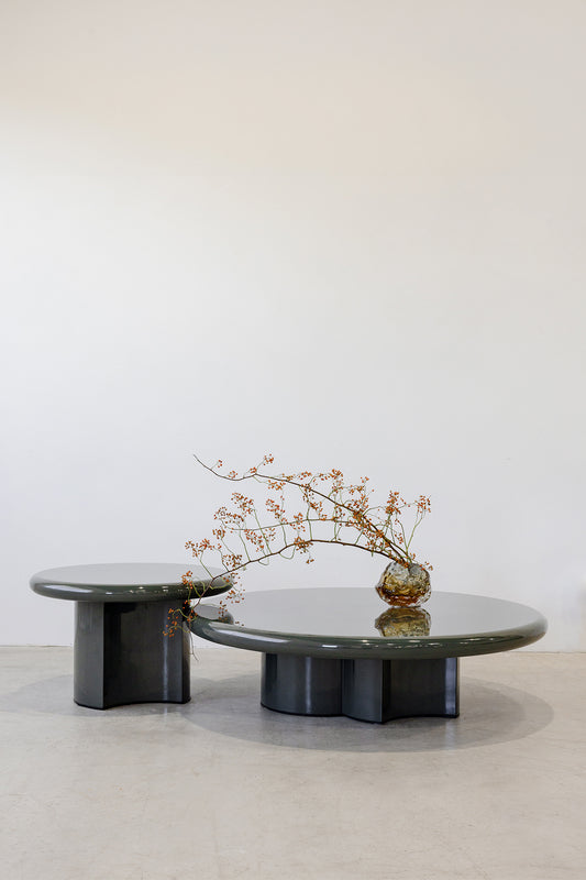 Playful proportions meet soothing colour in this rounded lacquered coffee table. Finished in a deep olive gloss, it’s a piece that balances graphic structure with gentle tactility.