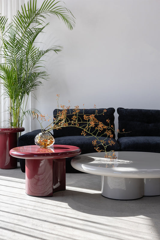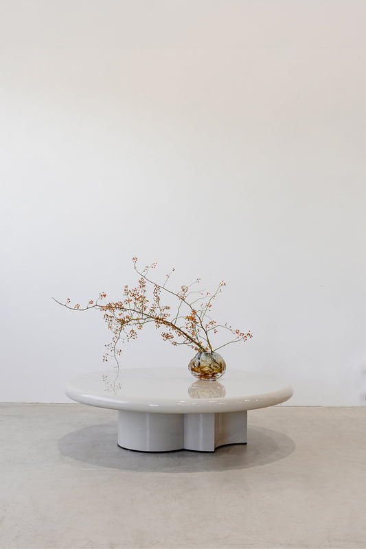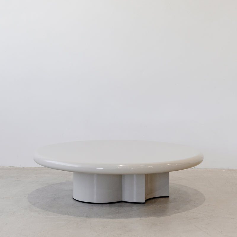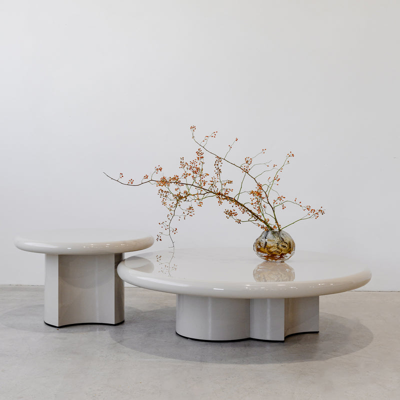 Playful proportions meet soothing colour in this lacquered coffee table. Finished in a soft putty gloss, it’s a piece that balances graphic structure with gentle tactility.