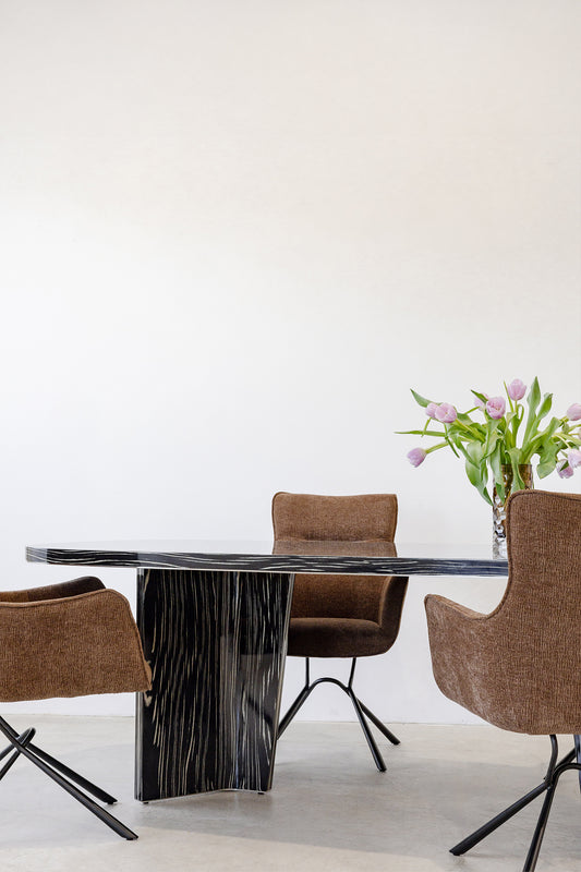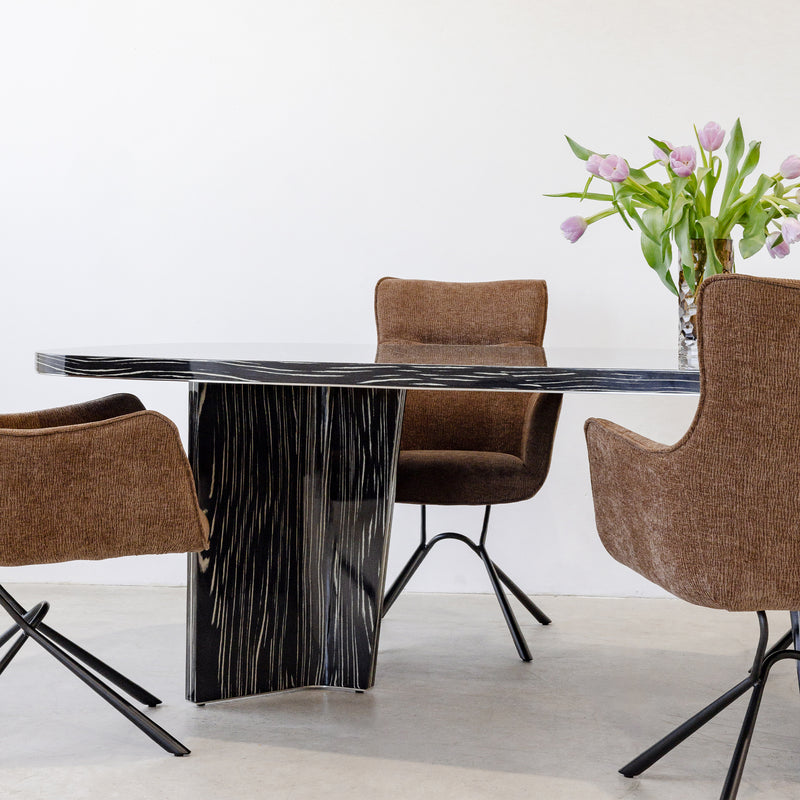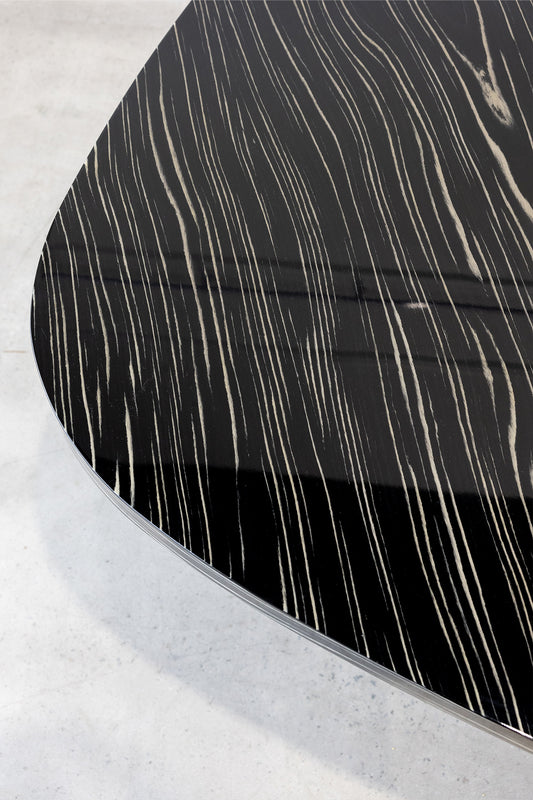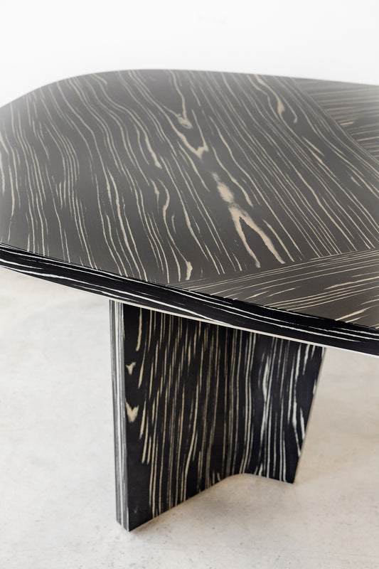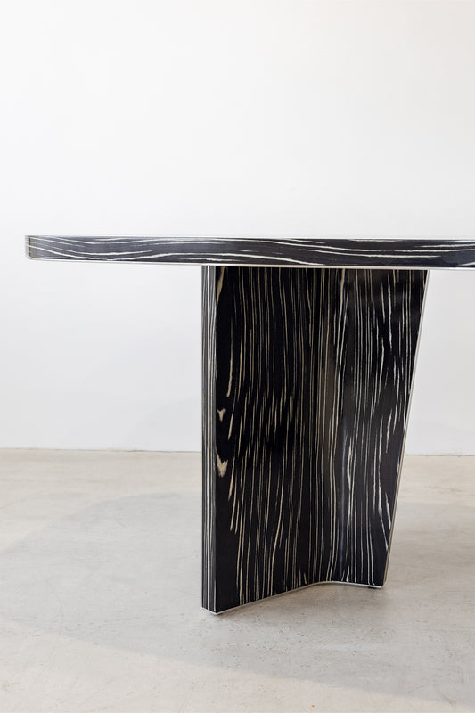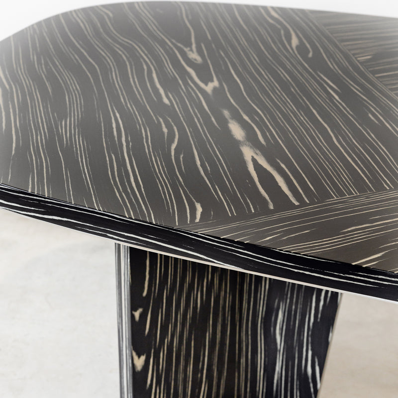 A striking statement in form and finish, the Leclerc table nods to retro office design with its bold silhouette and black tone, complimented with ivory timber-like detailing.