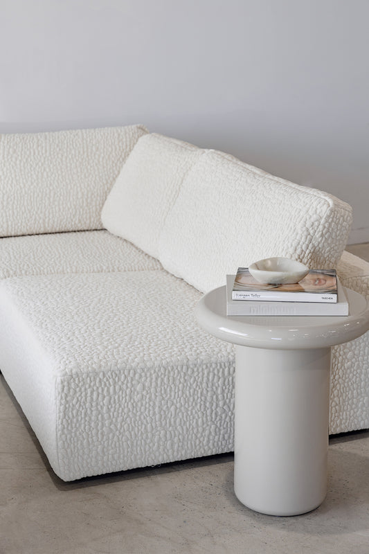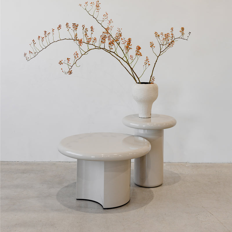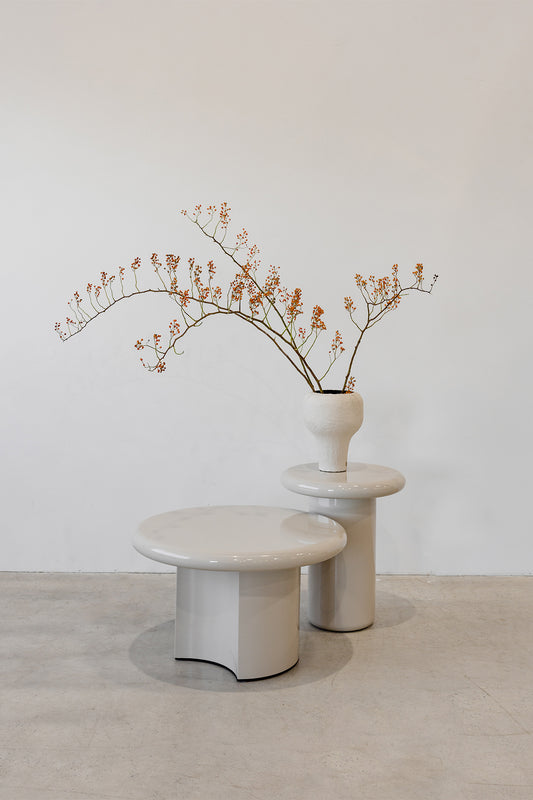 Compact yet commanding, this cylindrical piece layers tone and form to create a functional statement piece. Its silhouette nods to retro design, finished in a soft putty gloss that anchors a room.