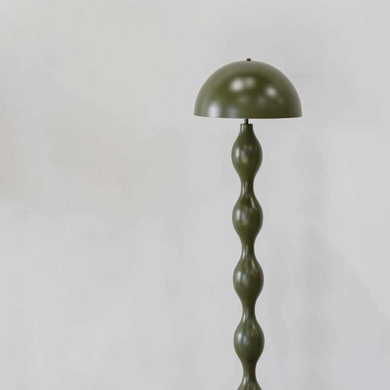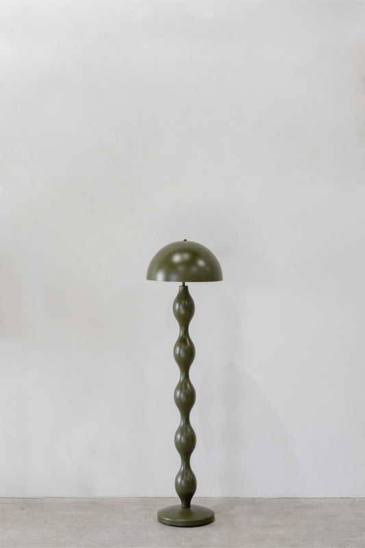 A refined statement piece, the Luc floor lamp pairs a simple dome shade with a sculptural base of tapered curves and a matte Olive finish. Its quiet elegance blends modern design with organic form to bring warmth and atmosphere to any space.