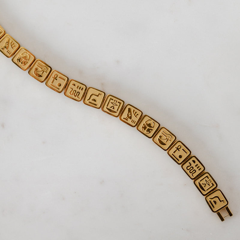 The Luxor bracelet, bold and adorned in golden hieroglyphics symbolising life, beauty, and immortality.
