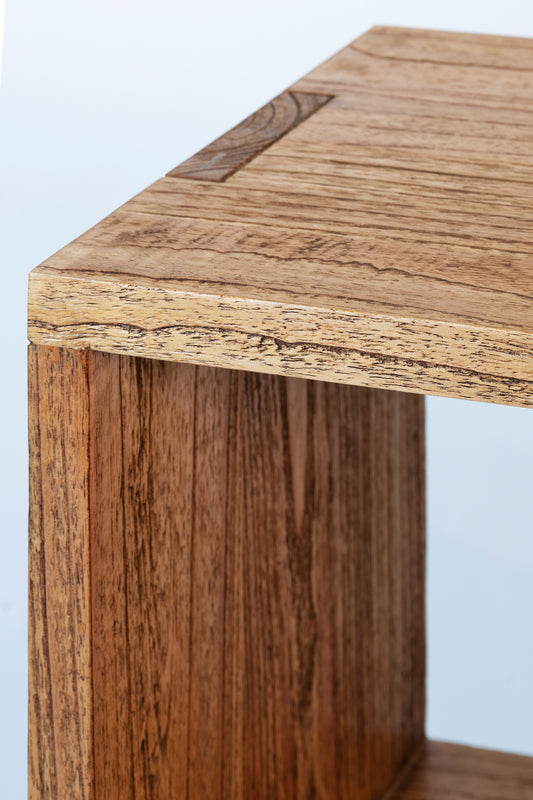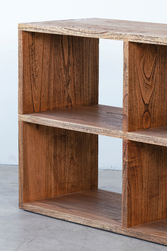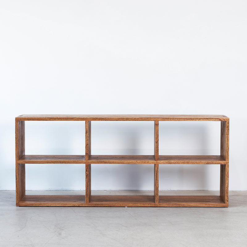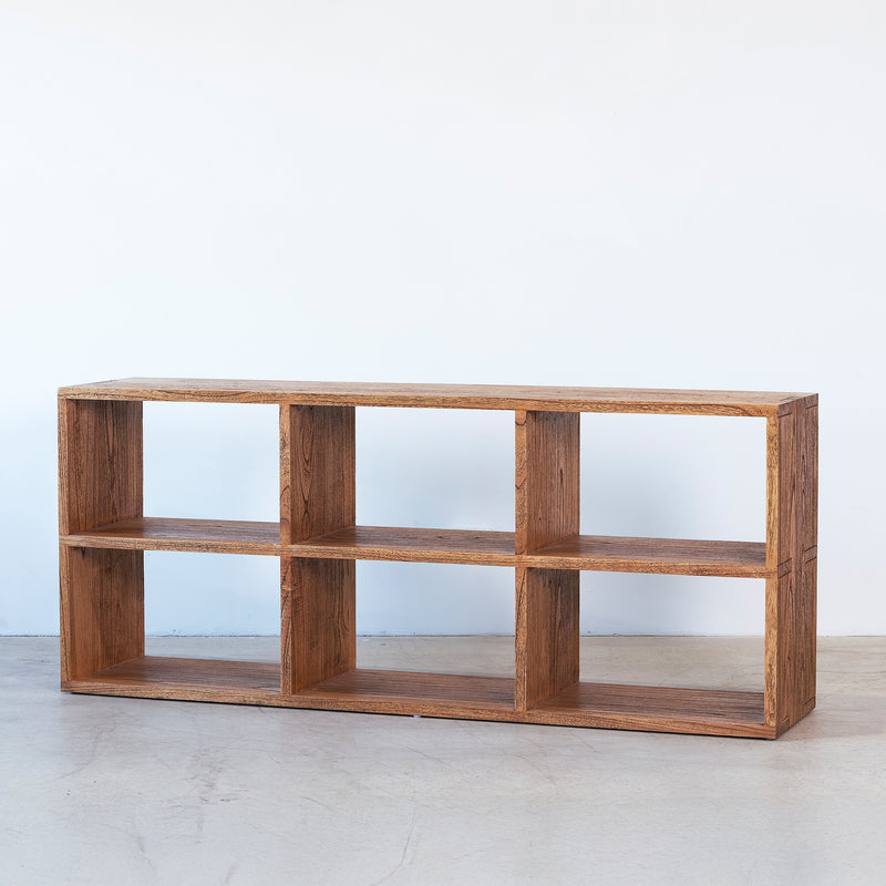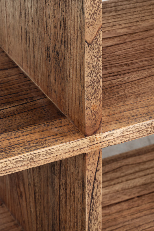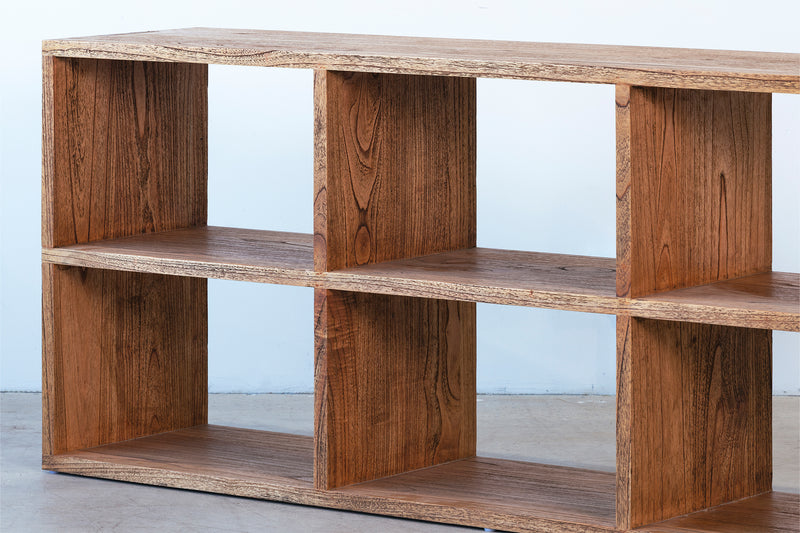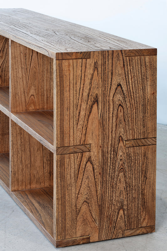 Built from solid mango wood in rustic matte finish. Six open storage compartments with joinery details on the edges, a beautiful bookcase or hall console.