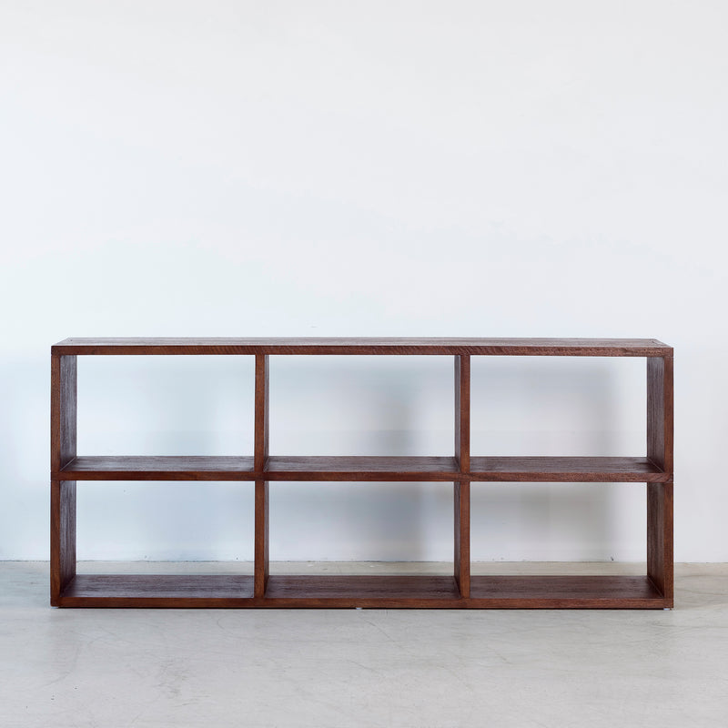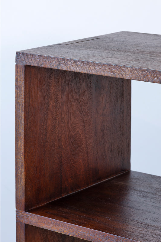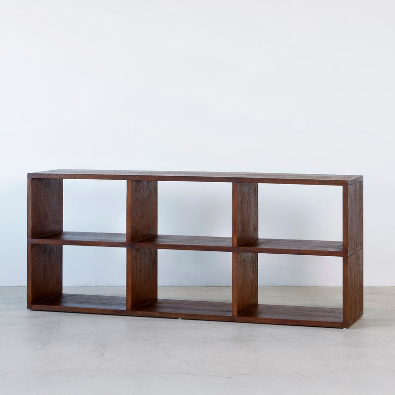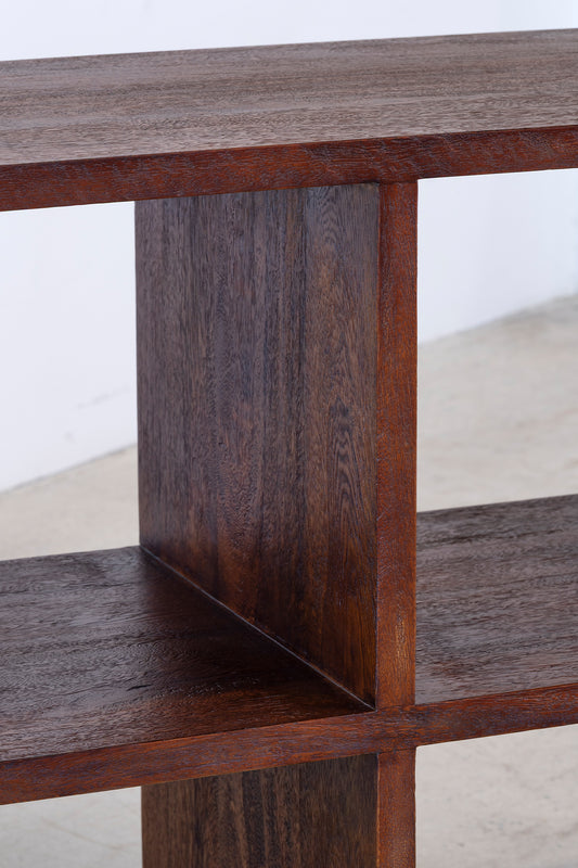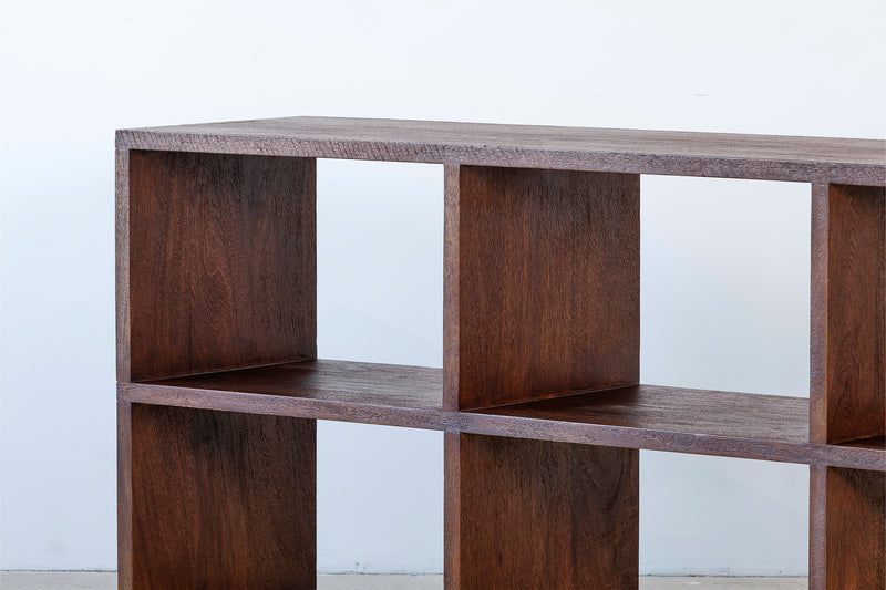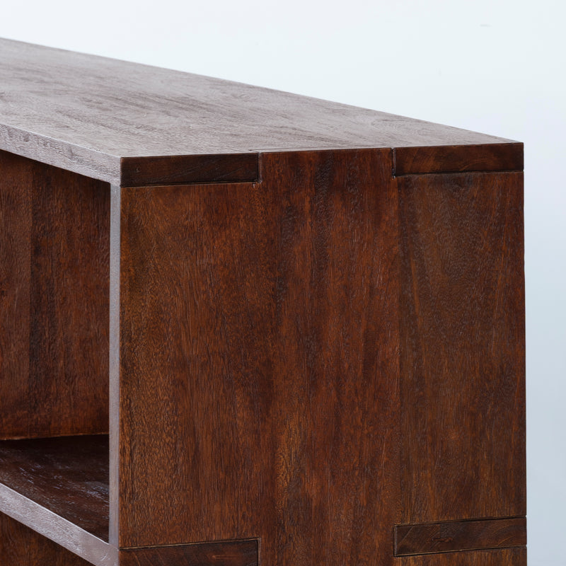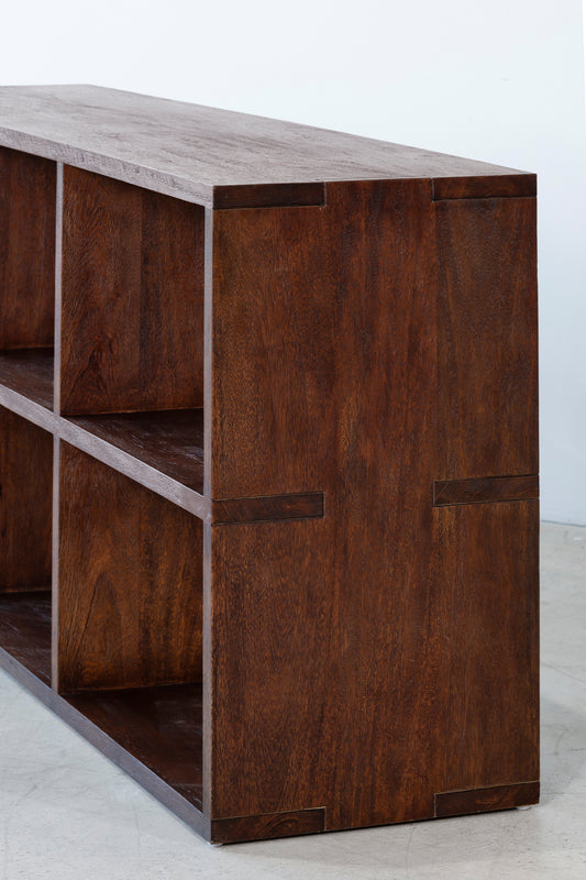 Built from solid mango wood in rustic walnut finish. Six open storage compartments with joinery details on the edges, a beautiful bookcase or hall console.
